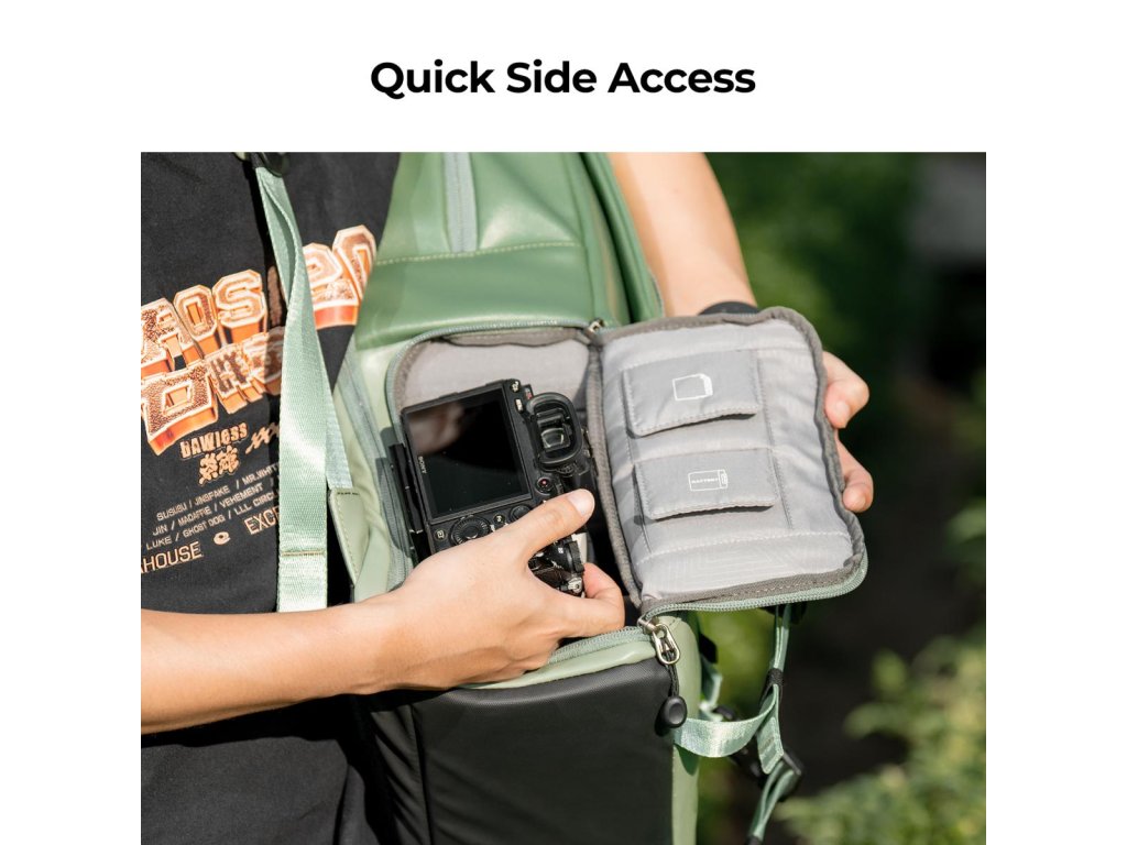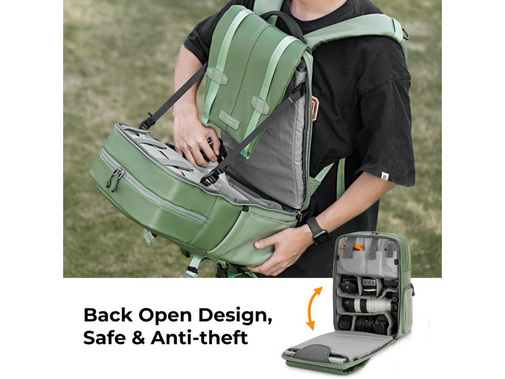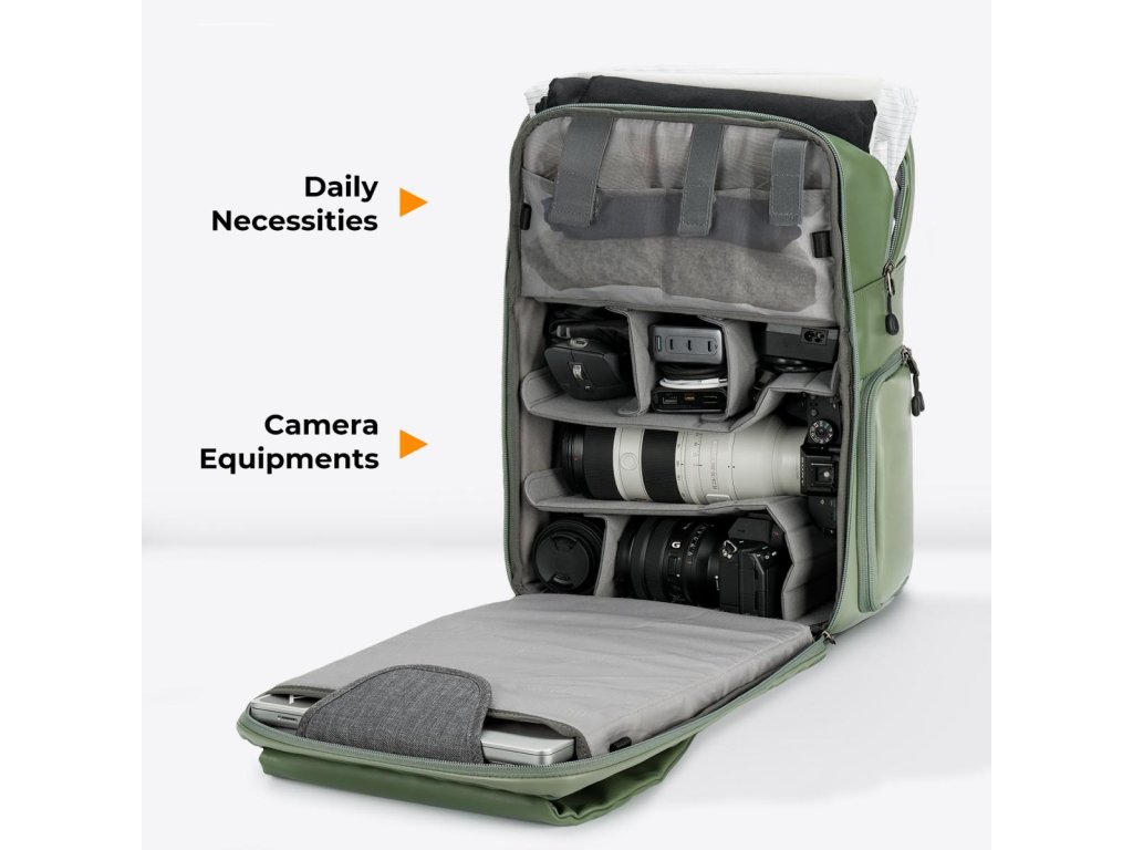 - * ?Conceput pentru fotografi? Buzunare interne speciale concepute pentru depozitarea pieselor de schimb fotografice precum filtre, inele adaptoare etc. Buzunar frontal ascuns pentru depozitarea accesoriilor de zi cu zi. Buzunarele laterale pot ține o sticlă de apă sau o umbrelă.