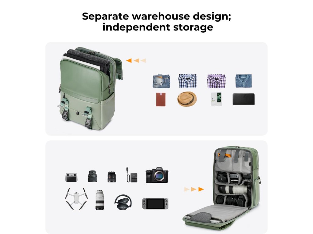 - * ?Capacitate mare 30 * 18 * 44 cm, aprox. 20L. Compartimentul superior este folosit pentru depozitarea diverselor obiecte personale precum haine, portofel, telefon mobil sau blitz; Există și un compartiment pentru un laptop de până la 15,6 inchi. Compartimentul inferior deține 1 cameră + 4 lentile și alte accesorii precum filtre, baterii sau carduri de memorie, sau pentru o dronă DJI.