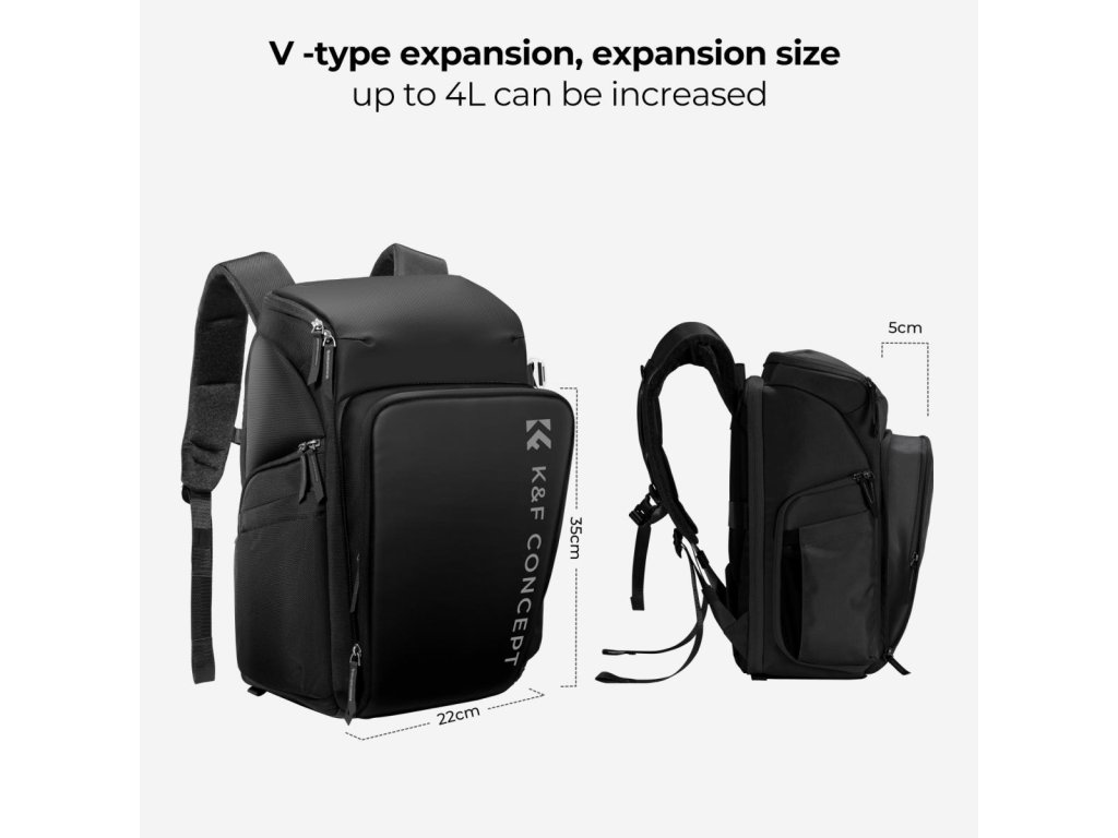 Rucsacul K&F Concept Photography are un „Design Bin Magic” versatil pentru spațiu reglabil, făcându-l potrivit pentru o varietate de scenarii de fotografie. Cu suport intern stabil, extindere a capacității, acces superior și lateral și un compartiment pentru computer agățat, asigură siguranță și confort pentru fotografi, în special pentru cei pasionați de fotografia în aer liber și de portret.