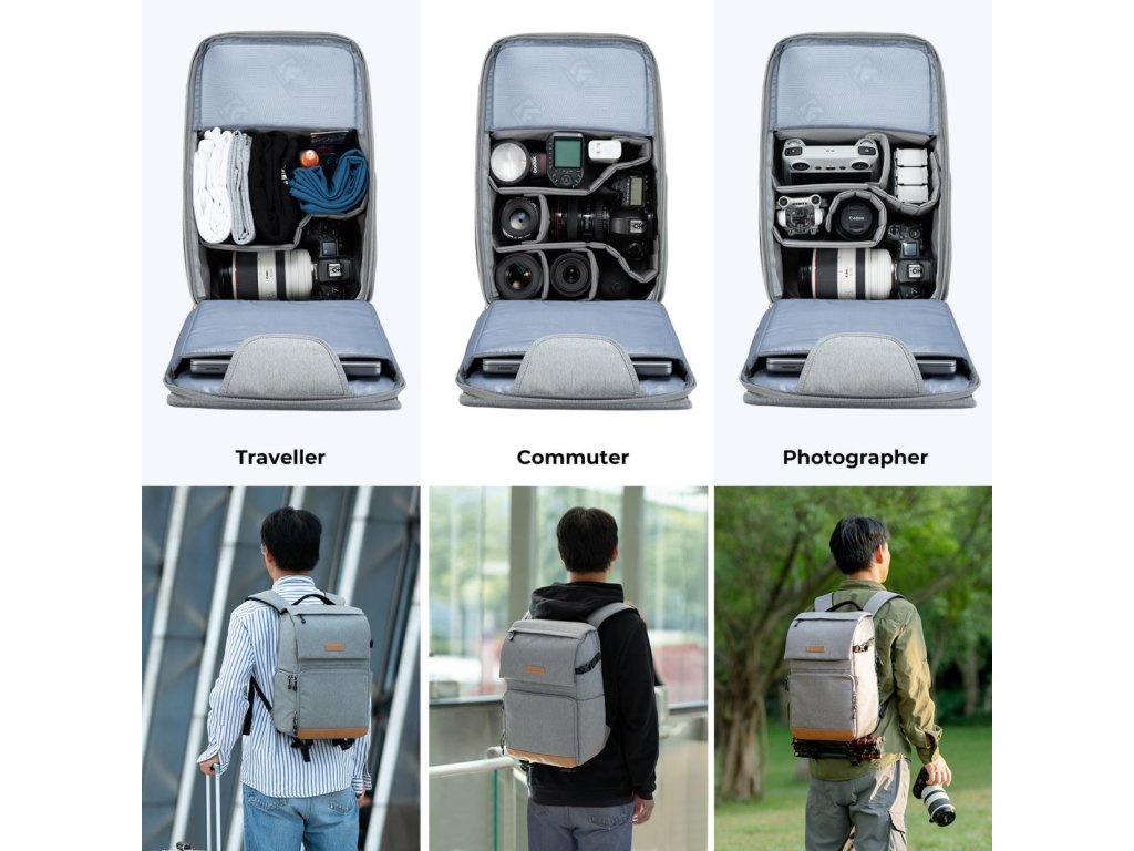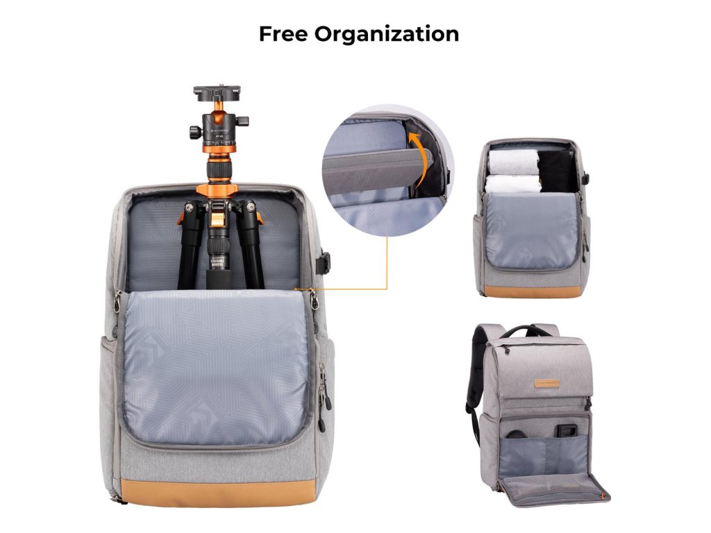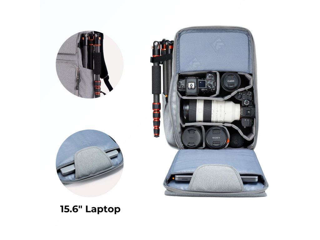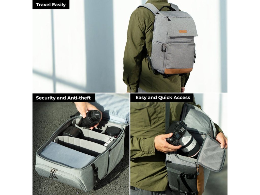 Rucsacul pentru cameră de 22 L de la K&F Concept oferă un design spațios și organizat, cu acces lateral rapid pentru acces ușor la echipamentul camerei fără a scoate rucsacul. Datorită divizoarelor interne flexibile și opțiunilor convenabile de atașare externă, asigură stocare eficientă și accesibilitate pentru fotografii în mișcare.