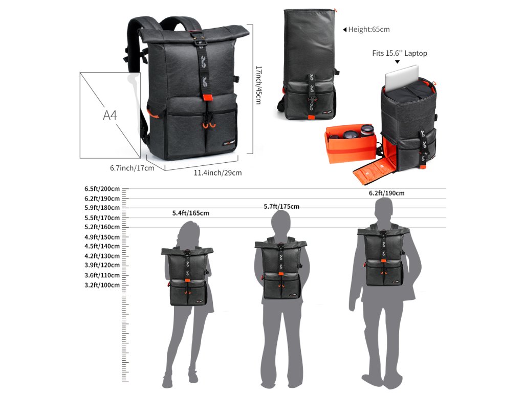 „• Capacitate mare: 20 l spațiu dedicat pentru cameră și laptop (până la 15”) cu partiții căptușite detașabile poate găzdui 1 cameră DSLR + 2 lentile și haine.