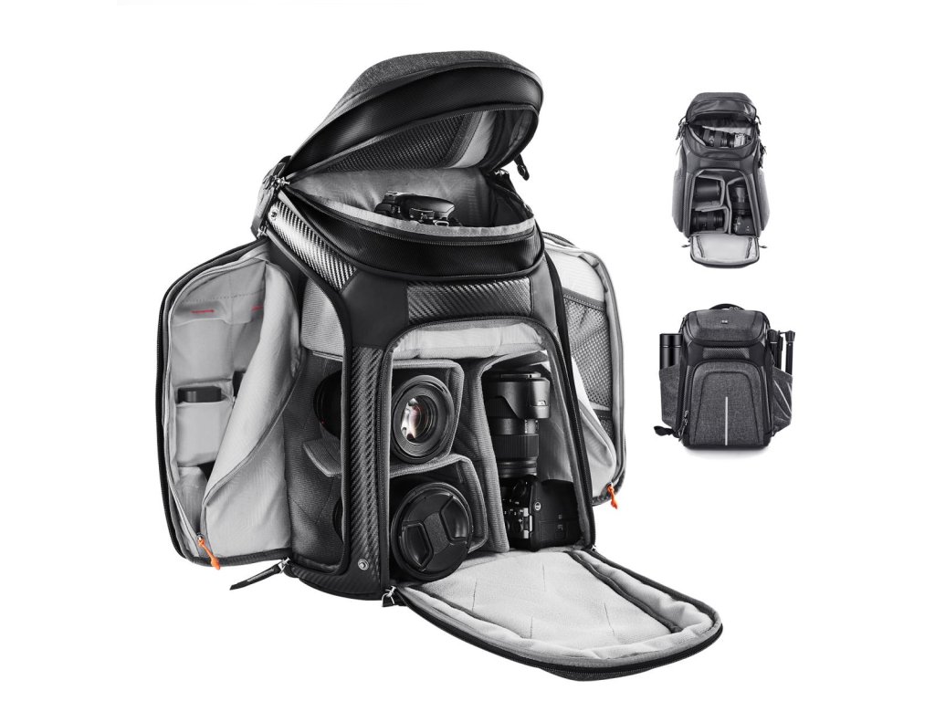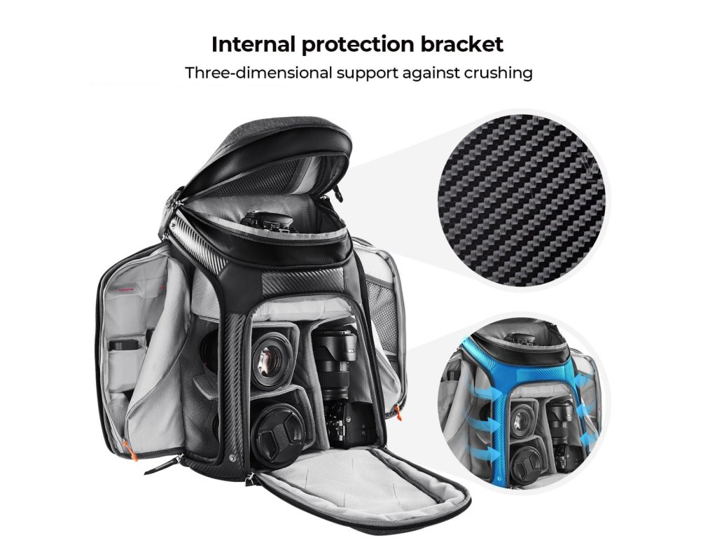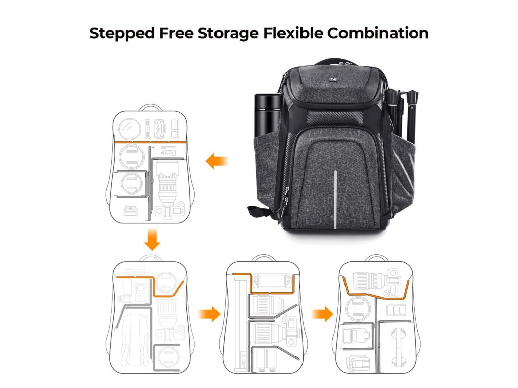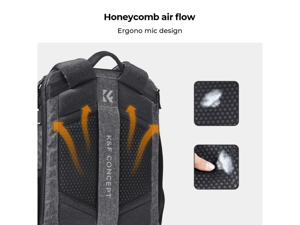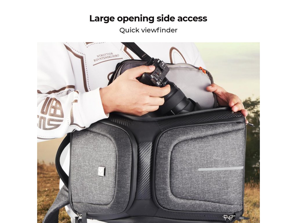 Rucsac pentru cameră de mare capacitate. Pentru a satisface nevoile fotografilor pentru călătorii și utilizarea zilnică, K&F Concept proiectează acest rucsac profesional pentru cameră cu o capacitate mare și poate ține 2 camere + 4 lentile + laptop de 15,6" (buzunar separat) + tabletă de 12,9" (buzunar separat) + trepied și altele echipament de cameră sau obiecte personale. Dimensiune: 44 * 29 * 24 cm. Compartimentul de sus conține articole esențiale de călătorie, cum ar fi haine, prosoape sau alte obiecte personale.