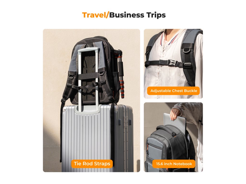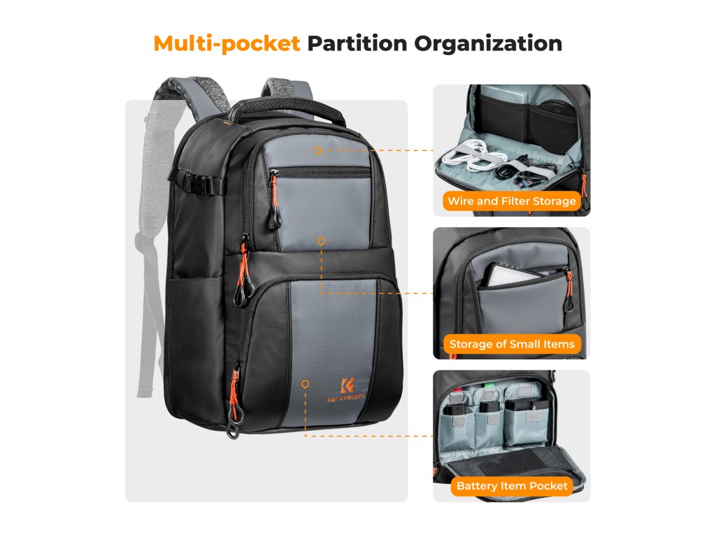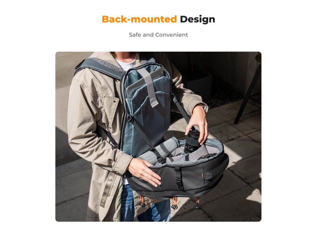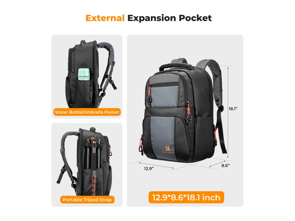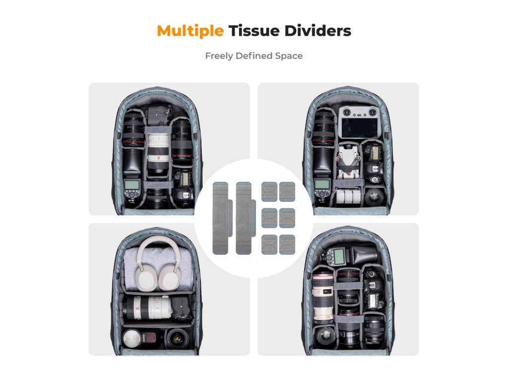 Buzunarele interne dedicate sunt concepute pentru a stoca piese fotografice precum filtre, inele adaptoare etc. Buzunar frontal ascuns pentru depozitarea accesoriilor de zi cu zi. Buzunarele laterale pot ține o sticlă de apă sau o umbrelă.