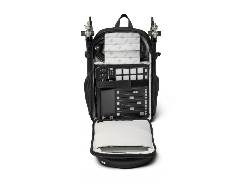 Rucsacul RODE este o geantă de transport personalizată pentru seria RODECaster, inclusiv RODECaster Pro sau RODECaster Pro II. Fabricat din materiale de înaltă calitate, inclusiv un mâner Alcantara® moale și durabil, chingă din nailon balistic și un exterior rezistent la apă, este robust și durabil. Conține un RODECaster Pro sau Pro II, plus microfoane, brațe de studio și alte accesorii, precum și laptopuri de până la 16 inchi. Curelele de umăr reglabile ergonomice cu suport pentru spate și piept asigură confort absolut, buzunarele și compartimentele externe oferă spațiu suplimentar de depozitare.