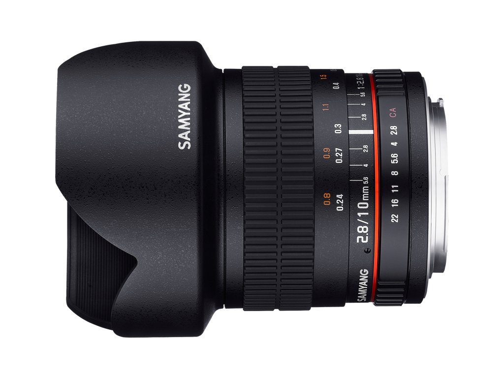 Obiectivul Samyang 10mm F2.8 ED AS NCS CS este un obiectiv manual cu unghi larg conceput pentru camerele digitale SLR cu senzor APS-C. Datorită distorsiunii reduse, unui unghi larg de vizualizare (109,5°) și unei diafragme foarte mari de F2,8, fotografii pot crea fotografii realiste și clare ale peisajelor și arhitecturii.Construcția sa constă din 14 membri în 10 grupuri, inclusiv 2 membri asferici și 1 sticlă cu dispersie luminoasă (ED) foarte scăzută. Tratamentul de suprafață Nano Coating System (NCS) este utilizat aici, care creează un nivel și mai scăzut de reflexie și un contrast mai mare decât tratamentul de suprafață Ultra Multi Coating (UMC). Transmiterea luminii pentru a minimiza blițurile și umbrele nedorite este, de asemenea, foarte mare.