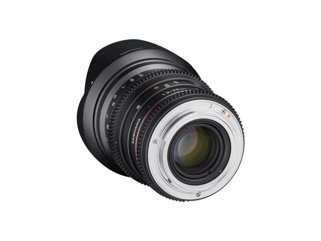 Samyang 20mm T1.9 ED AS UMC este un obiectiv destinat cinematografiei și special conceput pentru un sistem profesional de urmărire a focalizării datorită inelelor silențioase și netede (de-click) (apertura și focalizarea). Scara distanței și scara numărului T sunt situate pe ambele părți ale obiectivului pentru ușurință de fotografiere.
