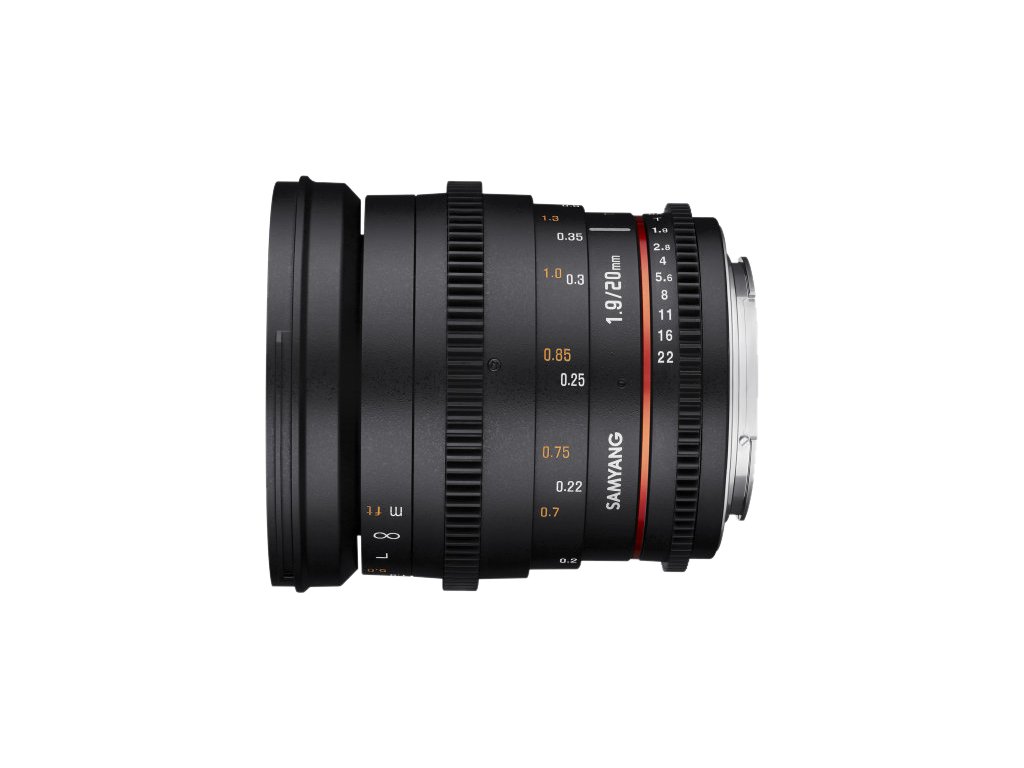 Samyang 20mm T1.9 ED AS UMC este un obiectiv destinat cinematografiei și special conceput pentru un sistem profesional de urmărire a focalizării datorită inelelor silențioase și netede (de-click) (apertura și focalizarea). Scalele de distanță și scalele cu numărul T sunt amplasate pe ambele părți ale obiectivului pentru o fotografiere ușoară.