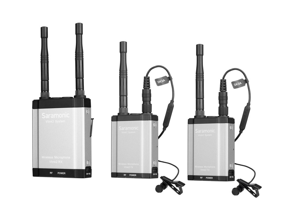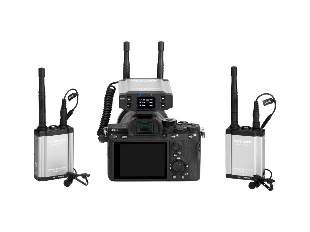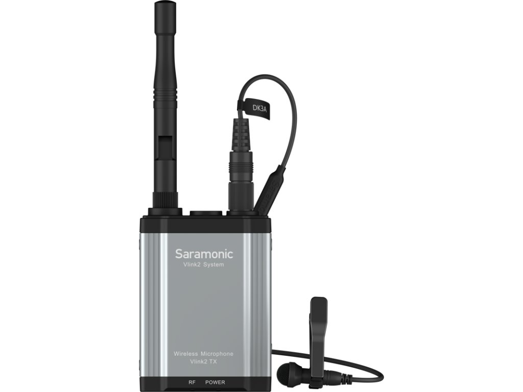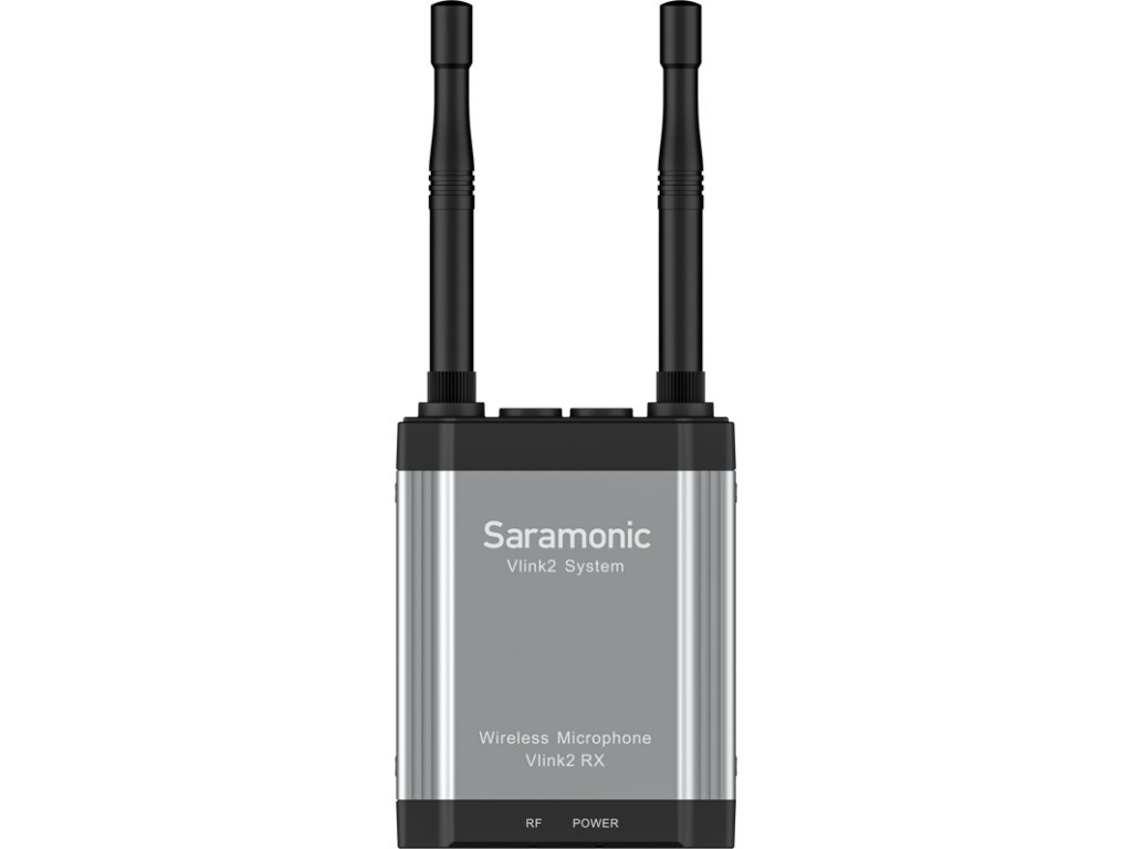Saramonic Vlink2 RX este un receptor cu două canale de 2,4 GHz cu montare pentru cameră fără fir. Se caracterizează printr-un afișaj OLED cu contrast ridicat și o funcție de talkback la transmițător. Cele două antene detașabile pot fi rotite la 360° pentru o recepție mai bună. Ieșirea receptorului poate fi comutată între modul mono și stereo. Funcția de talkback și monitorizare de pe receptor permite operatorilor de cameră selectarea individuală, dacă se dorește, iar comunicarea poate fi controlată cu un buton de dezactivare a sunetului.Clip transmițător TX Vlink2