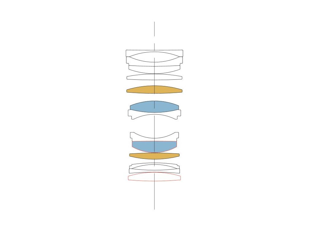 - 13 membri optici în 10 grupuri- 2x elemente FLD și 2x SLD, 2x element asferic și un element special cu un indice de refracție ridicat
