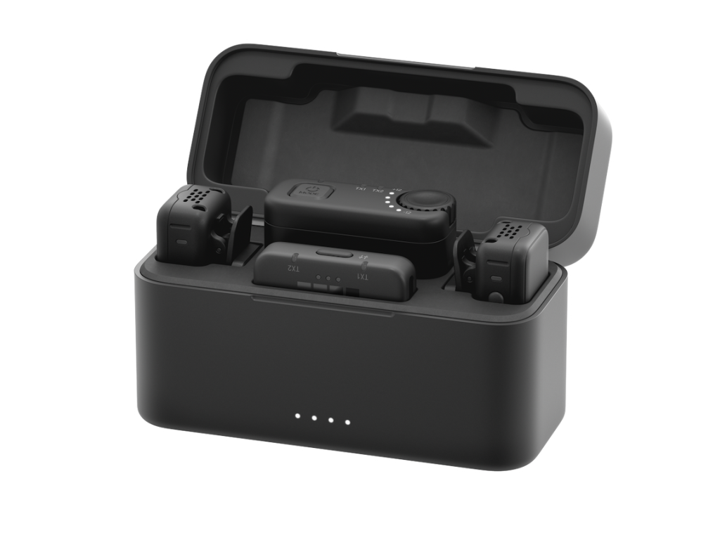 - 1× Carcasă de încărcare – carcasă de protecție compactă cu port de încărcare USB-C. Ambele sloturi pentru transmițător sunt atașate magnetic și se încarcă automat când carcasa este închisă. Carcasa conține propria baterie pentru încă două încărcări complete emițătoare.