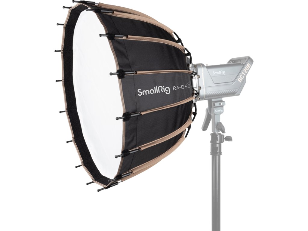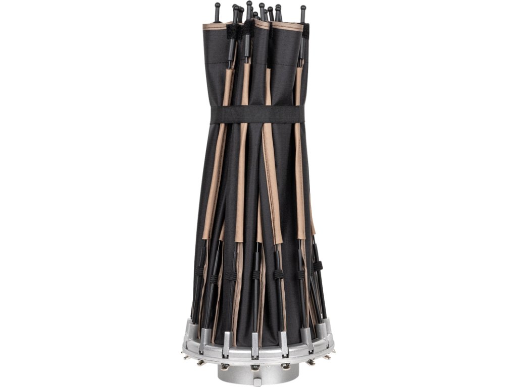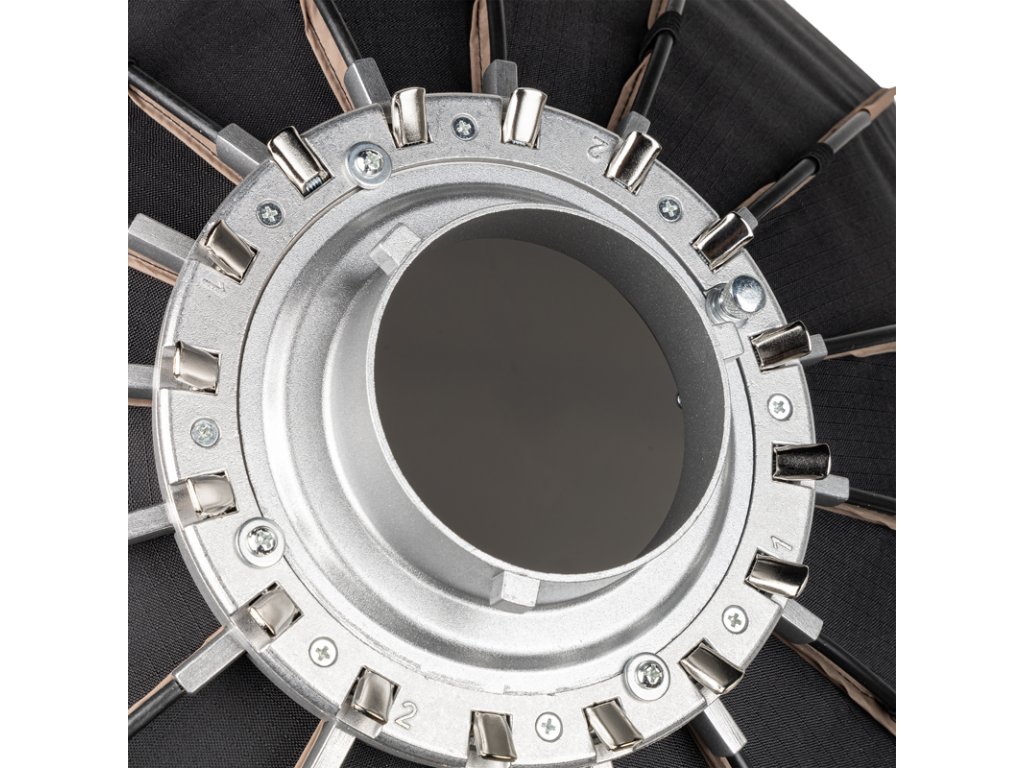 Designul revoluționar al nervurilor exterioare este de a se asigura că interiorul este neted, de a reduce pierderea de lumină și de a obține un efect de lumină mai strălucitor și mai moale, precum și de a preveni deplasarea și spargerea nervurilor interioare tradiționale. Cu 16 nervuri militare din oțel rezistent la temperaturi ridicate, mai ușoare, mai rigide și mai elastice decât nervurile obișnuite din oțel inoxidabil și de 3 ori mai ușor de instalat, pot rezista la zeci de mii de presiuni fără deformare. Softbox-ul are o suprafață luminoasă 3D și sferică. Designul atent al protectorului de mână din silicon previne frecarea mâinilor în timpul dezasamblarii.Difuzor și grilă din material textil