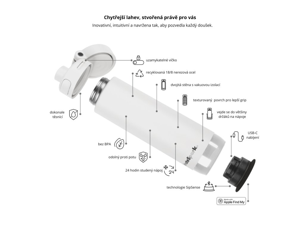 MenționatSenzorul SipSense folosește măsurarea precisă a greutății pentru a urmări fiecare înghițitură consumată și transmite wireless datele către aplicația mobilă HidrateSpark.Pe lângă binecunoscutuliluminare circulară cu LED-uri,care se aprinde când vi se reamintește, acum puteți seta șidiverse semnale sonore– de la tonuri blânde la melodii jucăușe care te motivează să bei la momentul potrivit. Atât culoarea și stilul efectului de iluminare, cât și tipul de sunet pot fi selectateîl poți personaliza complet după gustul tău și rutina zilnică. ÎncărcareSenzorul se încarcă ușor și rapid. Funcționează printr-un cablu USB-C standard, astfel încât puteți folosi orice folosiți în mod normal pentru telefon sau căști. O altă inovație foarte practică esteCompatibilitatea senzorilor între modelele din seria HidrateSpark PRO 2.Mai exact, puteți schimba senzorul mic între această sticlă de 621 ml și paharul de 887 ml, ceea ce oferă o flexibilitate deosebită. Mulțumesc.Asistență Apple Find MyÎn plus, poți găsi cu ușurință sticla dacă o pierzi sau o uiți. Bineînțeles, există șiSiguranța pentru sănătate a tuturor materialelor – sticla nu conține BPA sau plumb, iar întreținerea sa este rapidă și ușoară.