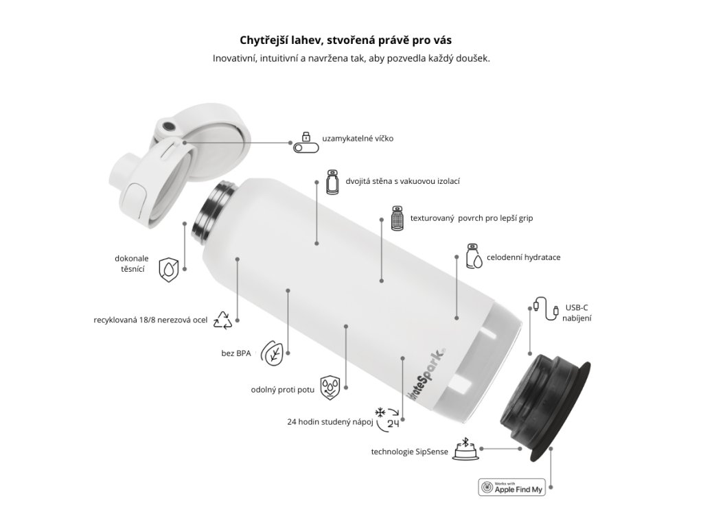 MenționatSenzorul SipSense folosește măsurarea precisă a greutății pentru a urmări fiecare înghițitură consumată și transmite wireless datele către aplicația mobilă HidrateSpark.Pe lângă binecunoscutuliluminare circulară cu LED-uri,care se aprinde când vi se reamintește, acum puteți seta șidiverse semnale sonore– de la tonuri blânde la melodii jucăușe care te motivează să bei la momentul potrivit. Atât culoarea și stilul efectului de iluminare, cât și tipul de sunet pot fi selectateîl poți personaliza complet după gustul tău și rutina zilnică. Încărcaresenzorul este ușor și rapid datorităPort USB-C,ceea ce este standard la majoritatea electronicelor de astăzi – gata cu cablurile suplimentare inutile. Datorită asistenței Apple Find My, puteți găsi cu ușurință sticla dacă o pierdeți sau o uitați. Desigur, există șiSiguranța pentru sănătate a tuturor materialelor – sticla nu conține BPA sau plumb, iar întreținerea sa este rapidă și ușoară.
