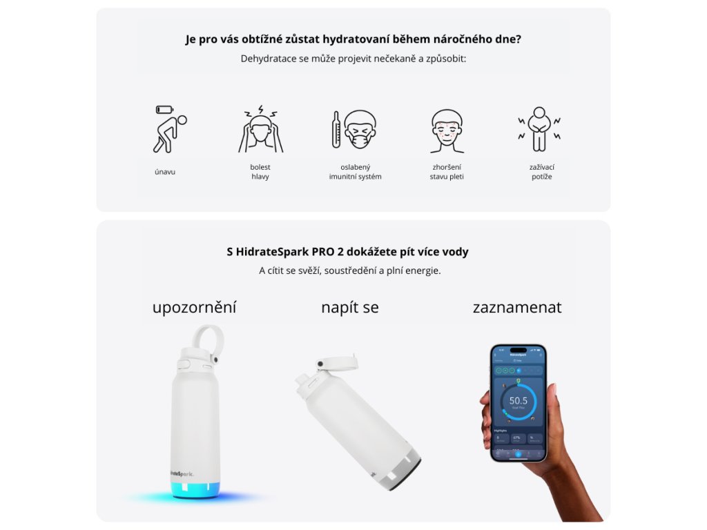 Cel mai inteligent termos din lume a fost lansat în 2014 și de atunci îi ajută pe oameni să dezvolte obiceiuri sănătoase. Sistemul de monitorizare a hidratării HidraSpark a fost dezvoltat pentru a susține în mod natural regimul zilnic de consum de alcool. Datorită semnalelor luminoase, este ușor să satisfaci nevoile organismului tău chiar și atunci când nu ai timp să-ți verifici telefonul. Cele mai recente cunoștințe în domeniul hidratării și stării de bine, verificate de experți din clinici și spitale, sunt acum disponibile sub formă de sticle inteligente de designer.