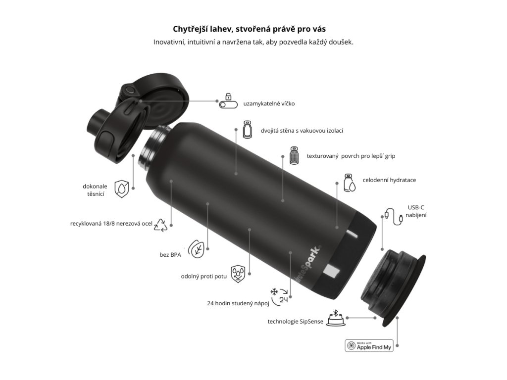 MenționatSenzorul SipSense folosește măsurarea precisă a greutății pentru a urmări fiecare înghițitură consumată și transmite wireless datele către aplicația mobilă HidrateSpark.Pe lângă binecunoscutuliluminare circulară cu LED-uri,care se aprinde când vi se reamintește, acum puteți seta șidiverse semnale sonore– de la tonuri blânde la melodii jucăușe care te motivează să bei la momentul potrivit. Atât culoarea și stilul efectului de iluminare, cât și tipul de sunet pot fi selectateîl poți personaliza complet după gustul tău și rutina zilnică. Încărcaresenzorul este ușor și rapid datorităPort USB-C,ceea ce este standard la majoritatea electronicelor de astăzi – gata cu cablurile suplimentare inutile. Datorită asistenței Apple Find My, puteți găsi cu ușurință sticla dacă o pierdeți sau o uitați. Desigur, există șiSiguranța pentru sănătate a tuturor materialelor – sticla nu conține BPA sau plumb, iar întreținerea sa este rapidă și ușoară.
