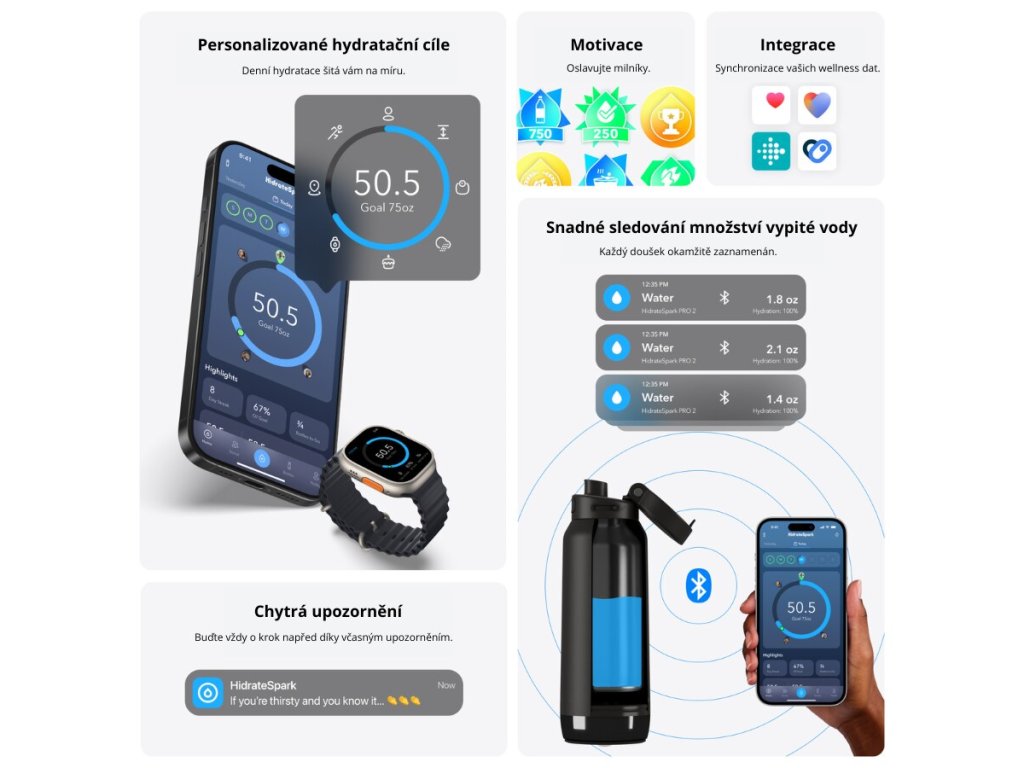 Știm că a bea suficiente lichide este crucial pentru sănătatea noastră, dar în graba noastră zilnică, este ușor să uităm. Indiferent dacă stai la calculator, ești în mișcare sau ai o zi aglomerată, băutul este adesea primul lucru care trece cu vederea. De aceeaA fost creat HidrateSpark PRO 2 - o sticlă inteligentă care îți monitorizează hidratarea.Nu ai nevoie de notificări pe mobil sau de numărarea paharelor -Senzorul integrat urmărește consumul de apă și vă reamintește să beți folosind efecte luminoase și semnale sonore blânde.Hidratarea regulată ajută la prevenirea oboselii, a durerilor de cap și a scăderii concentrării. HidrateSpark vă va ajuta în acest sens discret, dar în mod fiabil - oricând, oriunde.Mai modern, mai inteligent și mai practic ca niciodată