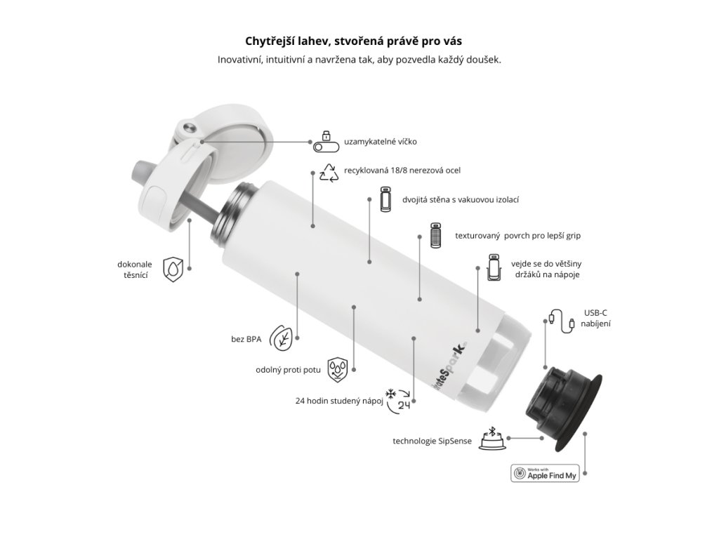 MenționatSenzorul SipSense folosește măsurarea precisă a greutății pentru a urmări fiecare înghițitură consumată și transmite wireless datele către aplicația mobilă HidrateSpark.Pe lângă binecunoscutuliluminare circulară cu LED-uri,care se aprinde când vi se reamintește, acum puteți seta șidiverse semnale sonore– de la tonuri blânde la melodii jucăușe care te motivează să bei la momentul potrivit. Atât culoarea și stilul efectului de iluminare, cât și tipul de sunet pot fi selectateîl poți personaliza complet după gustul tău și rutina zilnică. ÎncărcareSenzorul se încarcă ușor și rapid. Funcționează printr-un cablu USB-C standard, astfel încât puteți folosi orice folosiți în mod normal pentru telefon sau căști. O altă inovație foarte practică esteCompatibilitatea senzorilor între modelele din seria HidrateSpark PRO 2.Mai exact, puteți schimba senzorul mic între această sticlă de 621 ml și paharul de 887 ml, ceea ce oferă o flexibilitate deosebită. Mulțumesc.Asistență Apple Find MyÎn plus, poți găsi cu ușurință sticla dacă o pierzi sau o uiți. Bineînțeles, există șiSiguranța pentru sănătate a tuturor materialelor – sticla nu conține BPA sau plumb, iar întreținerea sa este rapidă și ușoară.