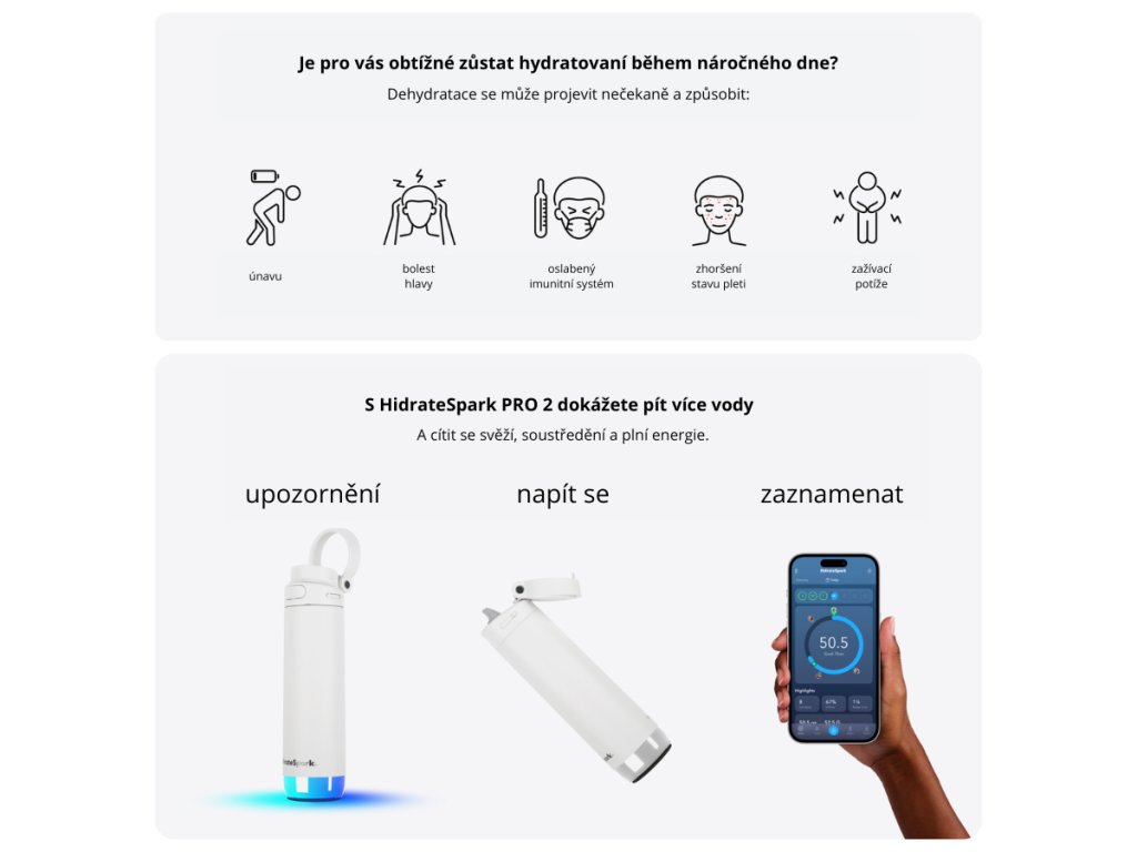 Consumul suficient de lichide este fundamentul sănătății, dar să fim serioși - câți dintre noi respectă cu adevărat un regim alimentar adecvat?HidrateSpark PRO 2 te va ajuta să creezi și să menții acest obicei, complet automat.Nu trebuie să setezi mementouri pe telefon sau să numeri cești.Senzorul inteligent detectează automat fiecare înghițitură pe care o iei și îți amintește să mai bei încă una.folosind un decentIluminare de fundal LED și semnal sonor.Poți lucra, călători sau face exerciții fizice fără întrerupere - sticla te va alerta la momentul potrivit. Vei observa în curând beneficiile hidratării regulate, cum ar fi reducerea oboselii, ameliorarea durerilor de cap, o concentrare și o performanță mai bune!Mai modern, mai inteligent și mai practic ca niciodată