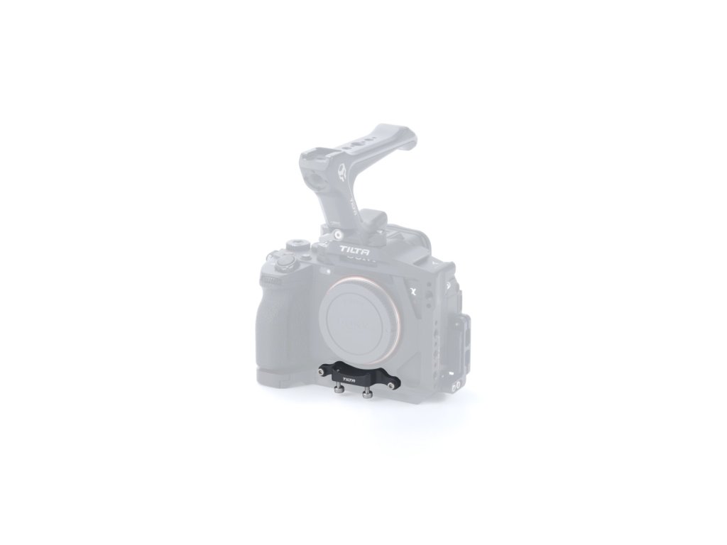 Această montură se atașează la partea din față a cuștii noastre pentru jumătate de cameră pentru Sony a7R V și acceptă adaptorul pentru obiective Metabones EF la E Mount T-Cine, precum și alte adaptoare cu puncte de atașare similare.