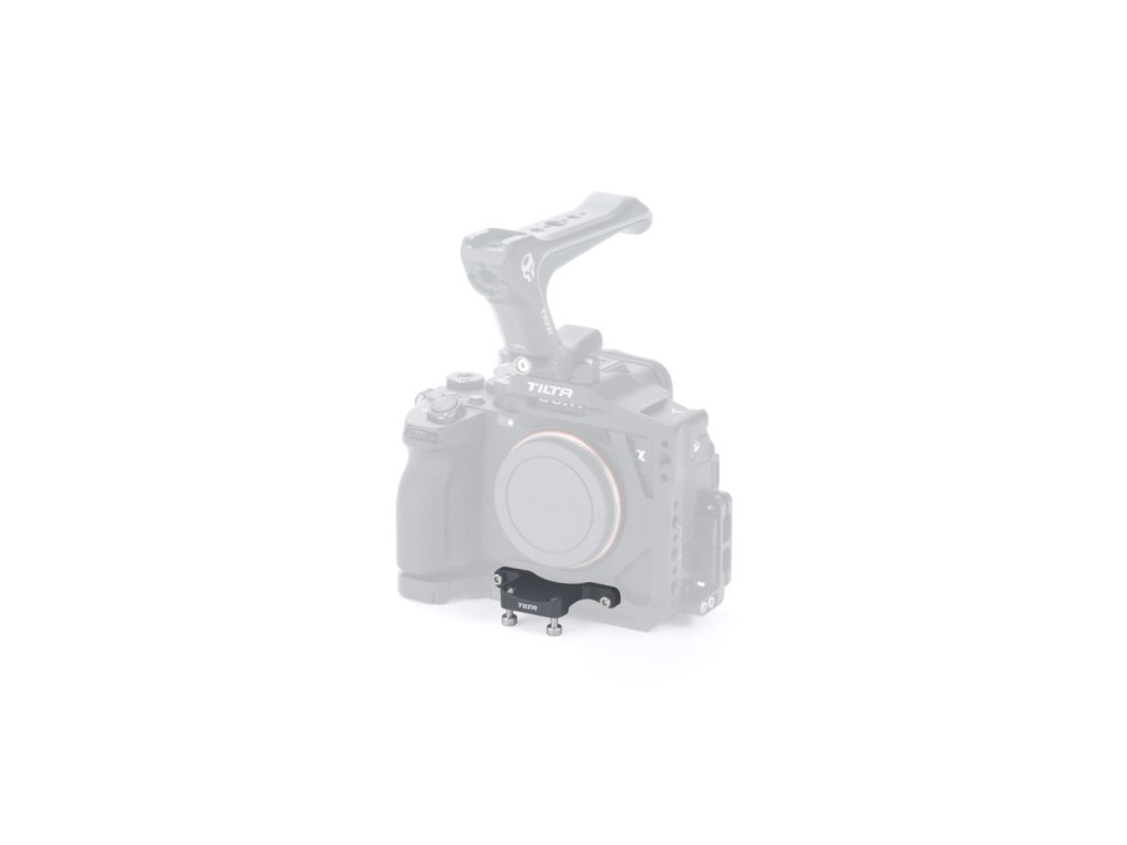 Această montură se atașează pe partea din față a cuștii noastre pentru jumătate de cameră pentru Sony a7R V și acceptă adaptorul pentru obiective Metabones PL la E Mount T-Cine, precum și alte adaptoare cu puncte de atașare similare.