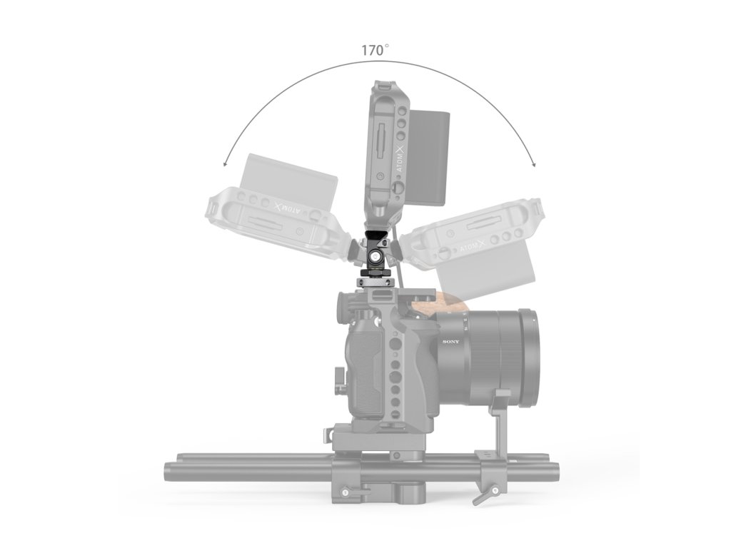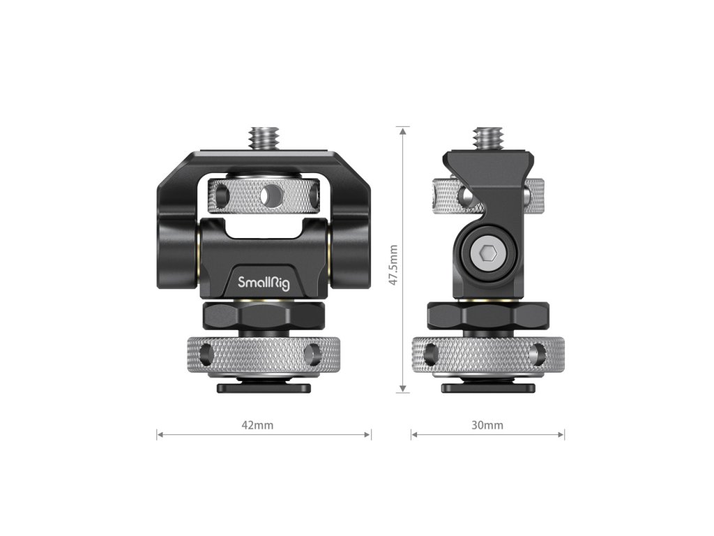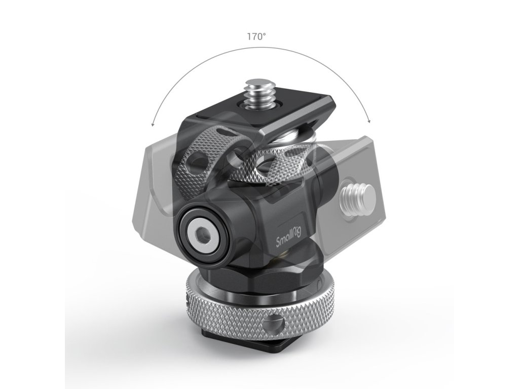 Suport pentru monitor SmallRig rotativ și pliabil cu suport pentru pantof rece. Dispune de un șurub de 1/4”-20 în partea de sus pentru un monitor, lumină sau microfon. Suportul permite rotirea la 360 ° în lateral și înclinarea la 170 ° cu oprire liberă în orice poziție. Etanșeitatea fiecărei axe poate fi reglată folosind o cheie hexagonală. Suportul robust este realizat din aluminiu prelucrat CNC și poate suporta un monitor de 5” și 7” cu o greutate de până la 1,5 kg. Suportul pivotant și înclinat are captuseală de cauciuc de protecție în partea de sus și include o cheie hexagonală pentru a strânge mânerele pentru un plus de siguranță.