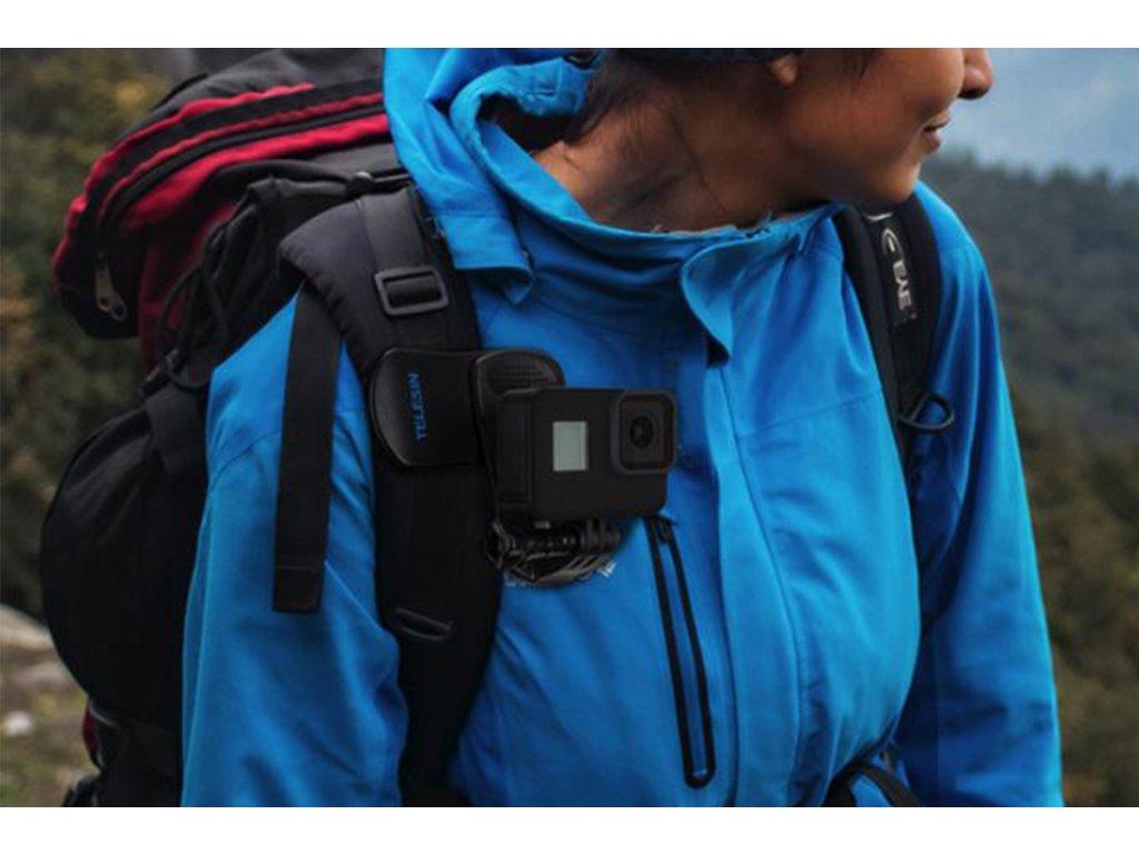 Suportul pentru rucsac Telesin este un accesoriu practic și ușor (64 g) pentru camerele de acțiune, care permite ca camera să fie rotită cu 360 de grade. Acest suport asigură o atașare stabilă a camerei la cureaua rucsacului și permite fotografierea confortabilă, fără a fi nevoie să țineți camera în mână. Ideal pentru activități în aer liber, drumeții, sport și alte experiențe dinamice în care doriți să aveți mâinile libere.