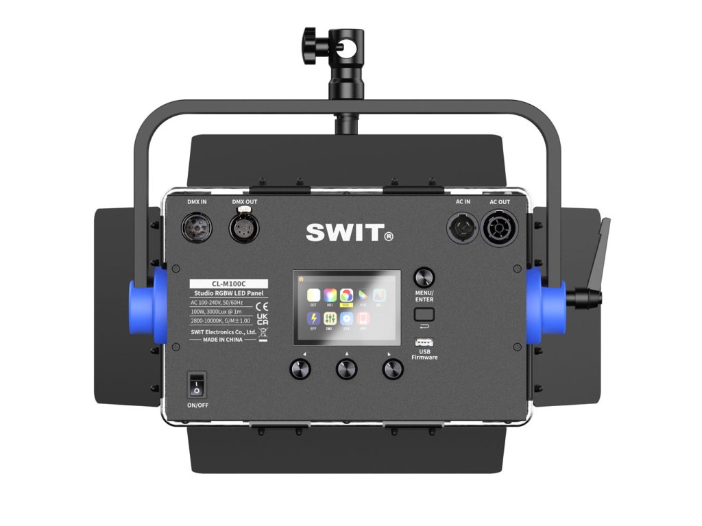 Panoul de control din spate al CL-M100C acceptă intrare și ieșire DMX cu 5 pini și un afișaj LCD color mare cu meniu și taste rapide pentru o selecție convenabilă a culorii. Portul USB-A este folosit pentru actualizarea firmware-ului sau pentru încărcarea unui profil de culoare utilizator și pentru alimentarea receptorului DMX fără fir. Ecran LCD color de 3,5 inchi încorporat cu selecție de culori vizualizată.