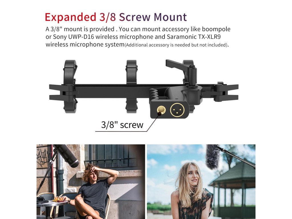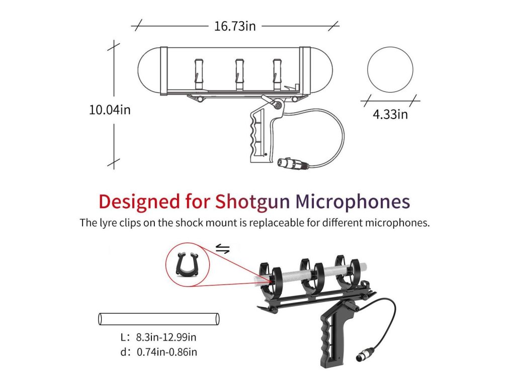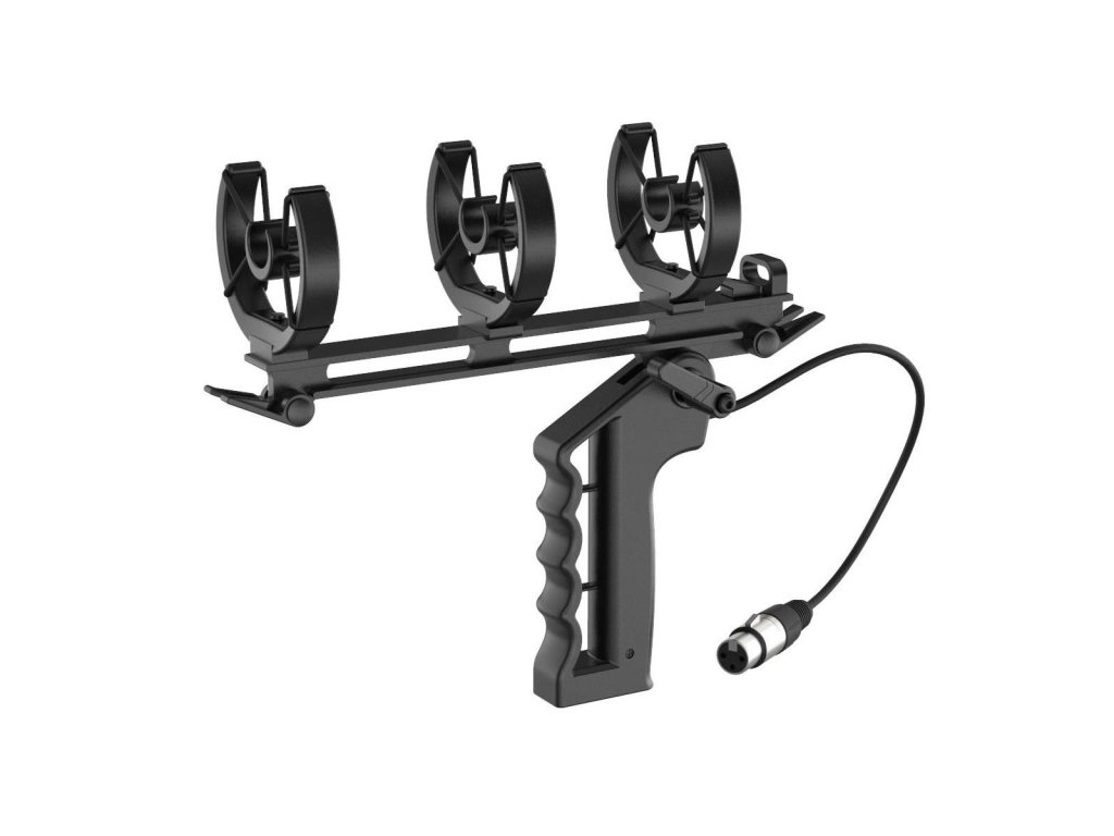 Toba de eșapament din cauciuc siliconic are suporturi ternare pentru clemele sale de microfon, care sunt asigurate de patru benzi elastice. Acest lucru permite monturii să absoarbă șocurile, vibrațiile și zgomotul de manipulare, permițând o înregistrare mai lină. Un suport de 3/8"-16 este prevăzut pe mâner pentru a atașa un mâner de pistol la un stâlp de lovituri și articole similare.