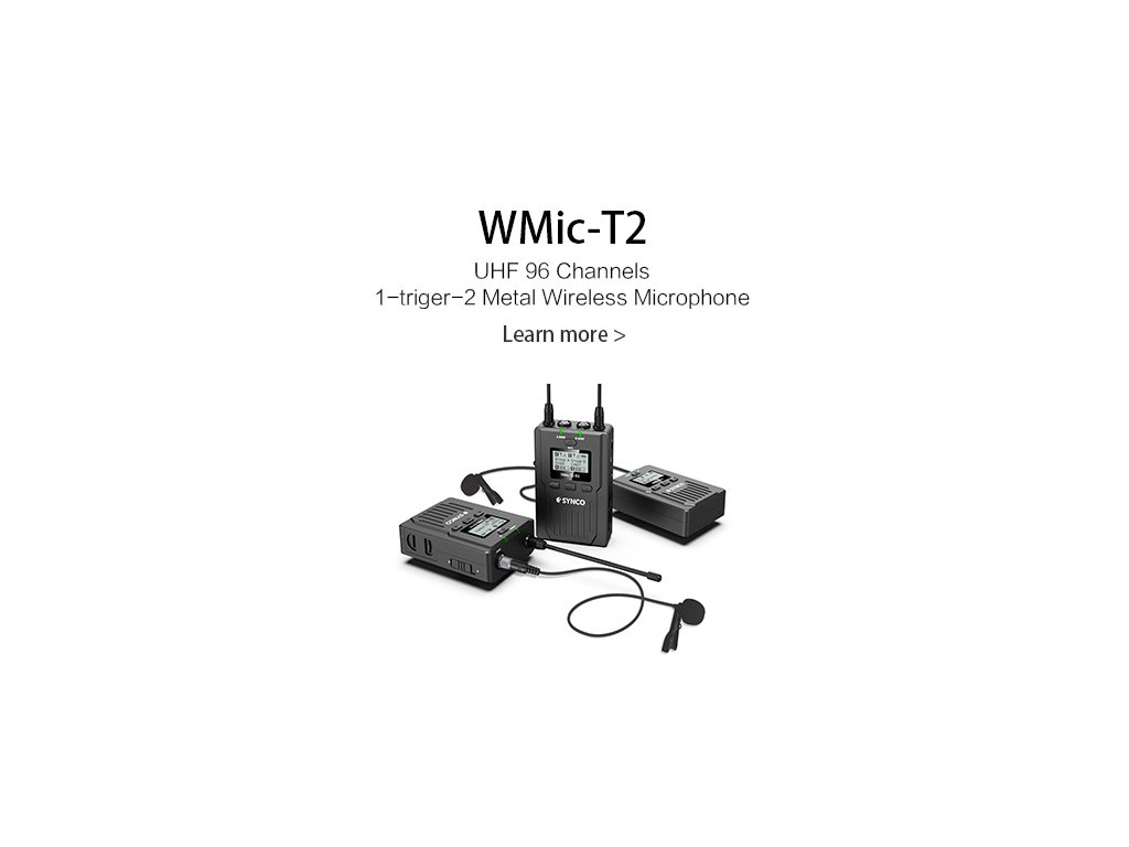 Synco WMic-T2 este un microfon fără fir integral metalic cu transmițător dublu declanșat de un receptor, cu două baterii AA, utilizează tehnologia FM fără fir UHF și ecran cu grilă LED de înaltă definiție: total 96 de canale, volum reglabil pe 16 niveluri și integrat în LCF, scanare automată, potrivire automată a canalelor IR, mod audio comutabil stereo/mono, ajustare a intensității semnalului RF, selectare dublă a intrării MIC/LINE IN, monitorizare a puterii la capătul receptorului, afișaj dinamic de captare a sunetului, reglarea luminii de fundal și alte funcții, în același timp, cu o performanță puternică de protecție împotriva zgomotului, este un microfon de calitate la nivel de difuzare.