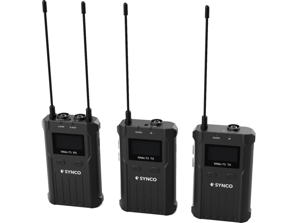 Synco WMic-T3 este un sistem wireless de microfon cu rever montat pe cameră, care oferă o soluție flexibilă și completă pentru videografi, vloggeri și jurnaliști mobili care au nevoie să înregistreze doi subiecte pe camere, camere video sau dispozitive mobile, cum ar fi smartphone-uri și tablete, inclusiv pe timp lung. distante. Sistemul folosește banda de frecvență UHF de la 512 la 537 MHz (Grupa A) și 564 la 589 MHz (Grupa B) pentru a evita interferențele de la sistemele de microfoane VHF și 2,4 GHz, Bluetooth și Wi-Fi. WMic-T3 include două microfoane revers omnidirecționale pentru captarea convenabilă a vocii în timpul înregistrării video, interviurilor și multe altele. Transmițătoarele pot conține surse de microfon sau semnale la nivel de linie. Receptorul cu două canale poate fi atârnat pe o curea, atașat la un pantof pentru cameră sau montat pe un trepied. Conectați ieșirea sa principală de 3,5 mm la o intrare pentru microfonul camerei utilizând cablul TRS furnizat, la intrarea unui dispozitiv mobil folosind cablul TRRS inclus sau la o cameră video profesională folosind cablul de 3,5 mm la XLR furnizat. O ieșire separată pentru căști de 3,5 mm vă permite să vă monitorizați semnalul în timp real pentru a vă asigura că nu prezintă distorsiuni.
