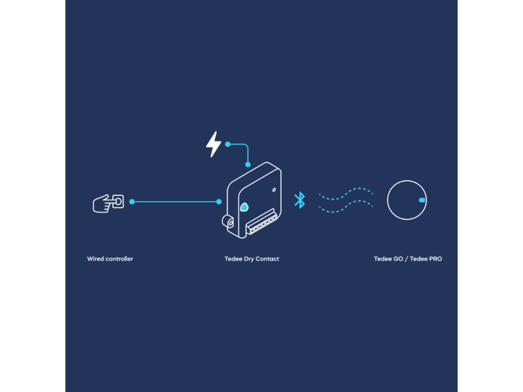 Să presupunem că vrei deblocați încuietoarea inteligentă tedee GO apăsând butonul fizic dedicat de la recepție, pentru a permite vizitatorilor să intre în unitate fără a utiliza aplicația pentru smartphone-ul tedee. Doar conectați contactul uscat tedee la un comutator cu fir compatibil alimentat cu baterie și asociați-l cu încuietoarea inteligentă. După apăsarea acestui buton, tedee Dry Contact începe deblocarea fără fir a blocării inteligente prin Bluetooth, eliminând astfel necesitatea unei aplicații sau a unei conexiuni online la cloud.Un alt exemplu din practică este conectarea tedeeului Contact uscat cu securitatea sau sistem de alarma. De exemplu, poate fi setat închiderea automată a ușii la activarea alarmei și notificarea imediată pentru un eveniment atât de grav prin aplicație.