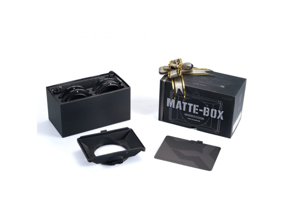 Un alt avantaj al acestei casete mate sunt cele două opțiuni de filtrare. Partea din față a cutiei mate oferă un slot pentru orice filtru standard 4×5,65. Filtrele cu șuruburi pot fi atașate la inelele adaptoare folosind un filet interior care se potrivește cu diametrul fiecărui inel adaptor. Inelul adaptor este atașat la obiectiv, îl puteți fixa pe cutia mată și apoi atașați șurubul la filtru. Setul include o mini cutie mată, un steag francez și patru inele adaptoare (82mm, 77mm, 67mm și 72mm). De asemenea, oferim inele adaptoare suplimentare în dimensiuni nestandard (52mm, 55mm, 58mm, 62mm, 85mm), precum și inele adaptoare pentru cinema (80mm și 85mm).