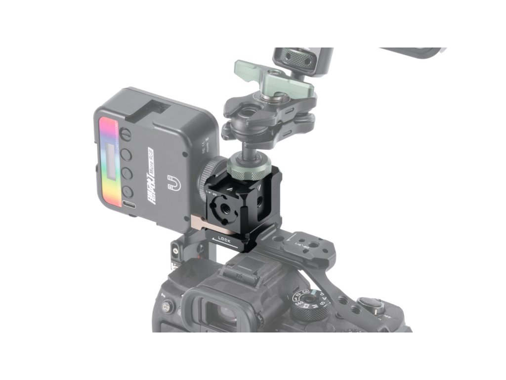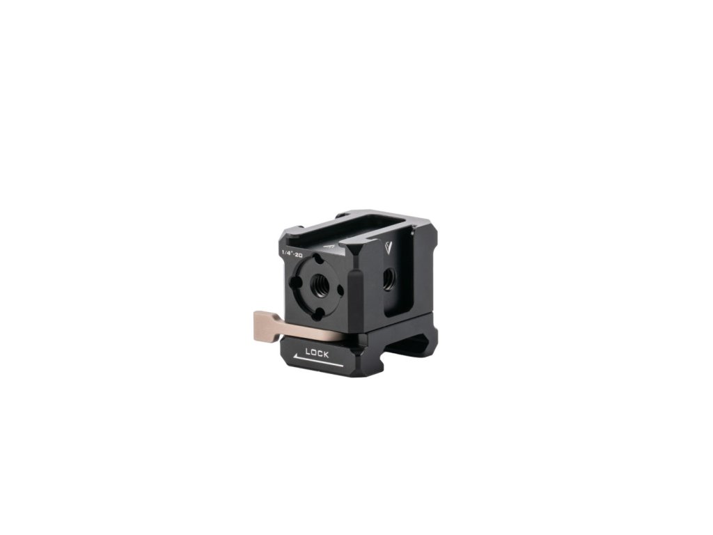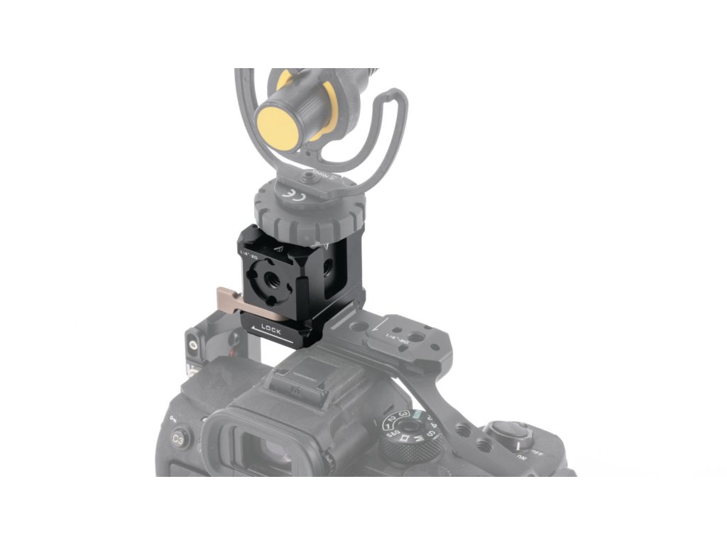 Acest suport de montare incredibil de mic include numeroase opțiuni pentru montarea accesoriilor, cum ar fi mai multe receptoare Cold Shoe, filete de 1/4”-20 și 3/8”-16 cu știfturi de ghidare.