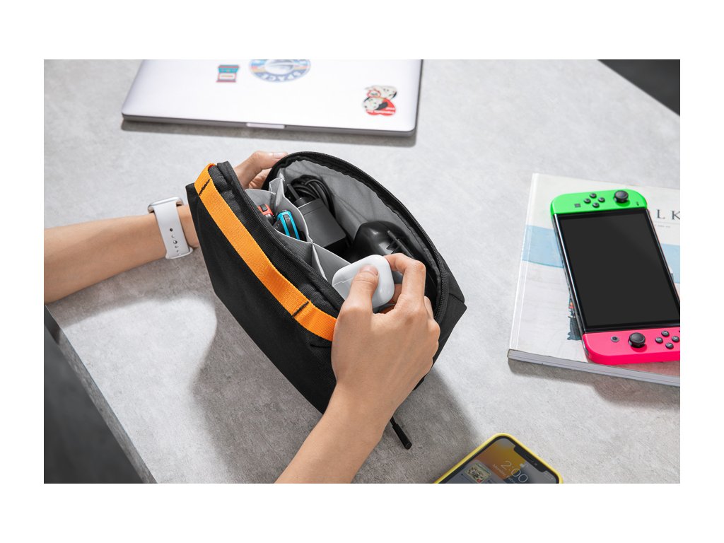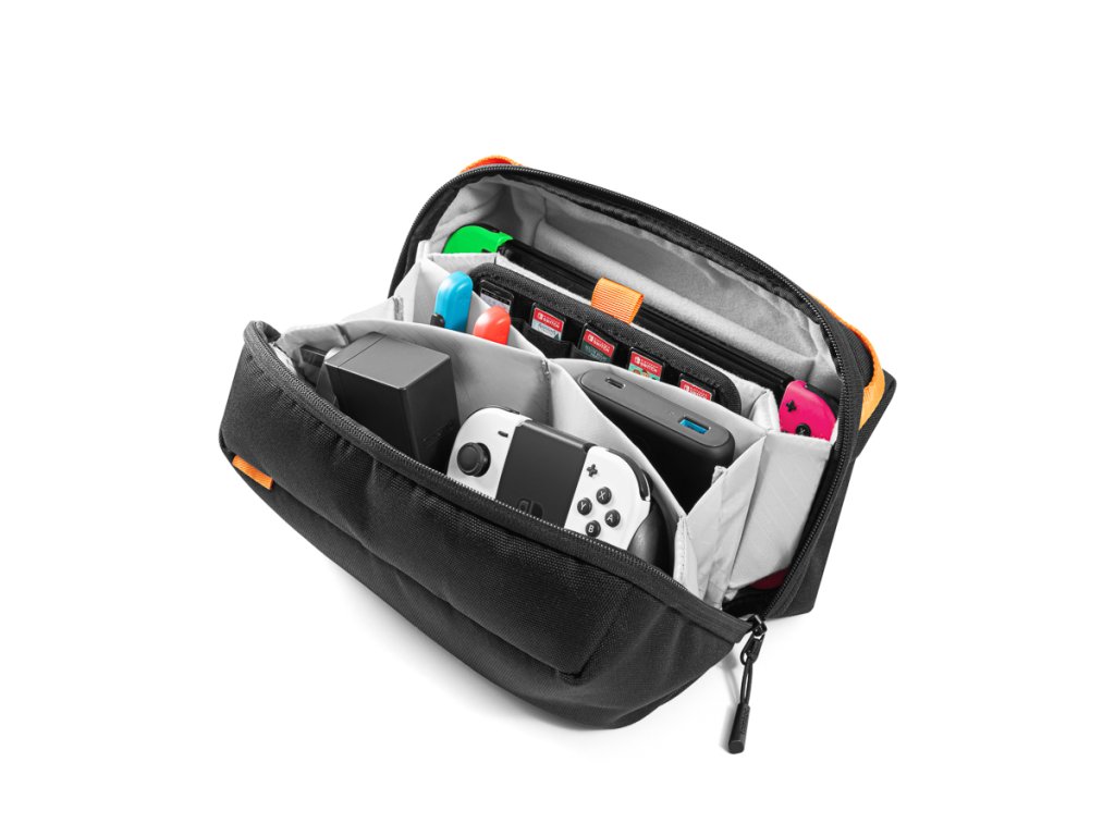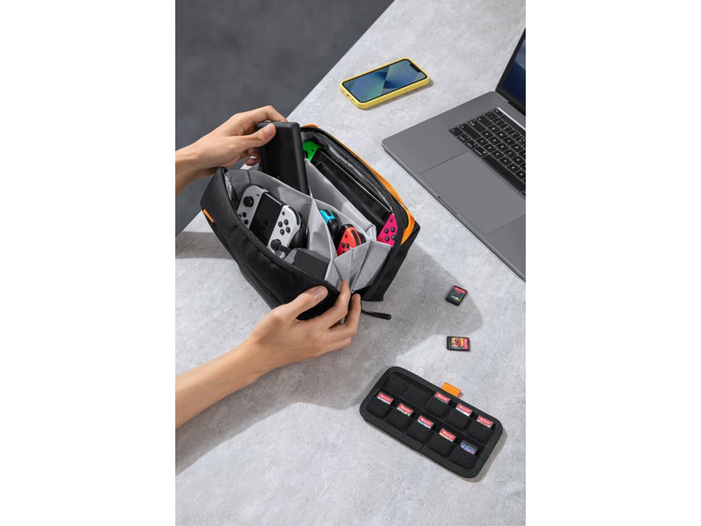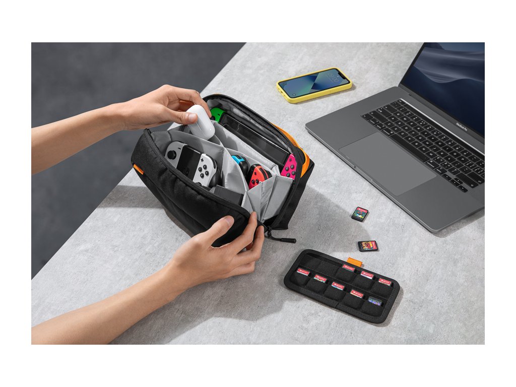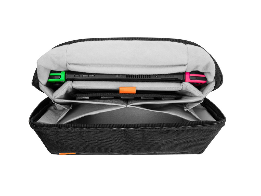 Trebuie să luați consola împreună cu accesoriile ei? Nici o problemă! Cinci compartimente și buzunare de diferite dimensiuni oferă suficient spațiu pentru a stoca tot ce ar putea fi la îndemână. Încărcătoarele, controlerele, inclusiv popularele Joy-Cons, cablurile sau bateriile suplimentare pot fi organizate frumos și întotdeauna la îndemână.