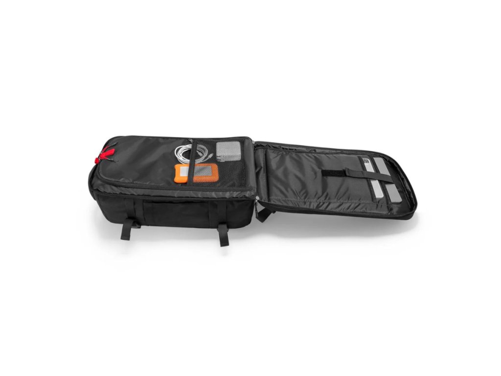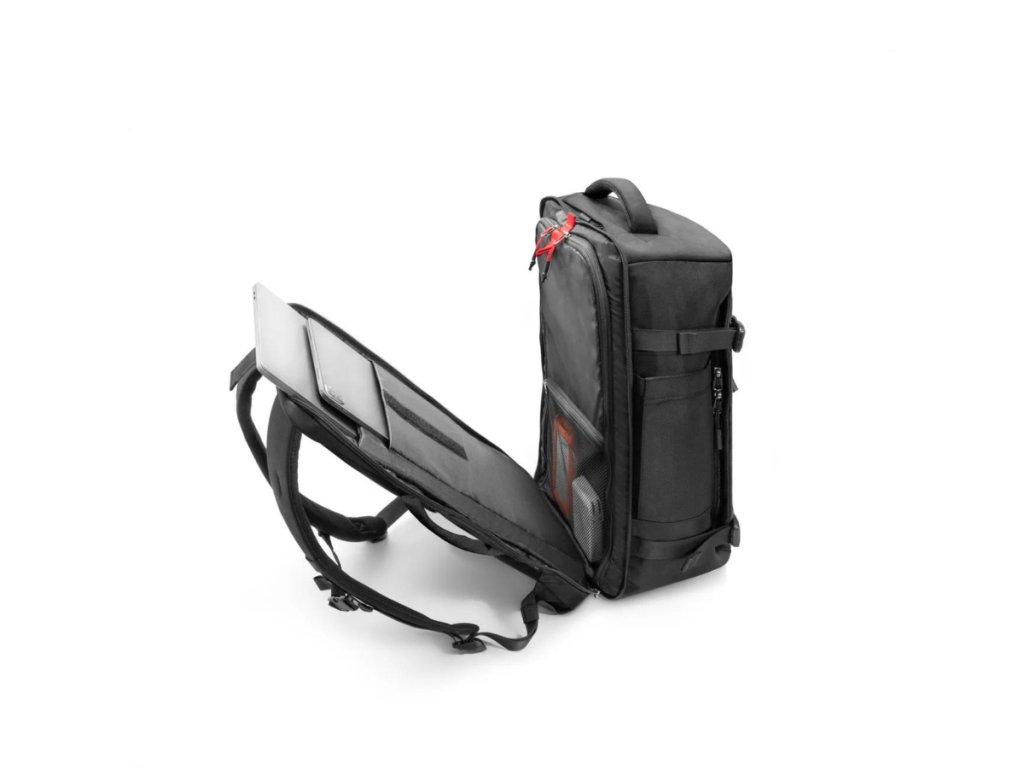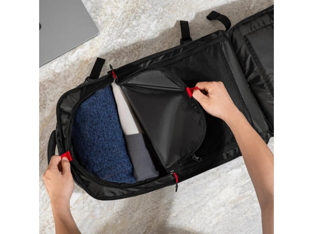 Există un rucsac împărțit în 3 secțiuni - compartiment principal, secțiune pentru accesorii electronice și buzunar frontal. Toate sunt destul de spațioase în sine și vă permit să vă organizați în mod clar articolele depozitate. Am putea eticheta partea din spate ca Departamentul Tehnic. Veți găsi 2 compartimente căptușite pentru o tabletă și un laptop. Există suficient spațiu pentru laptop de 17 inchi. Compartimentele sunt completate de un buzunar din plasă cu fermoar, ideal pentru depozitarea încărcătoarelor, cablurilor sau a unui hub. Această parte a rucsacului este concepută astfel încât să fie posibil deschis la un unghi de 90°-180°. Acest lucru va fi util, de exemplu, la controalele de securitate din aeroport, pentru care vă veți putea pregăti mai repede.Spre compartimentul principal il poti lua din buzunarul din fata cu acces rapid, poate fi si desfacut ca o valiza pentru împachetare și despachetare ușoară. Hainele și articolele de toaletă, cărțile sau un aparat foto își vor găsi locul aici. Nu mai există buzunare sau organizatoare în acest spațiu principal de depozitare - așa că aveți totul la dispoziție pentru trucurile de ambalare economice în practică. Compartimentul frontal al rucsacului poate fi din nou deschis larg la un unghi de până la 180 de grade. Spațiul de depozitare din el este puțin mai modest, dar este dotat cu un alt buzunar plasă cu fermoar pt depozitarea în siguranță a articolelor mai mici.