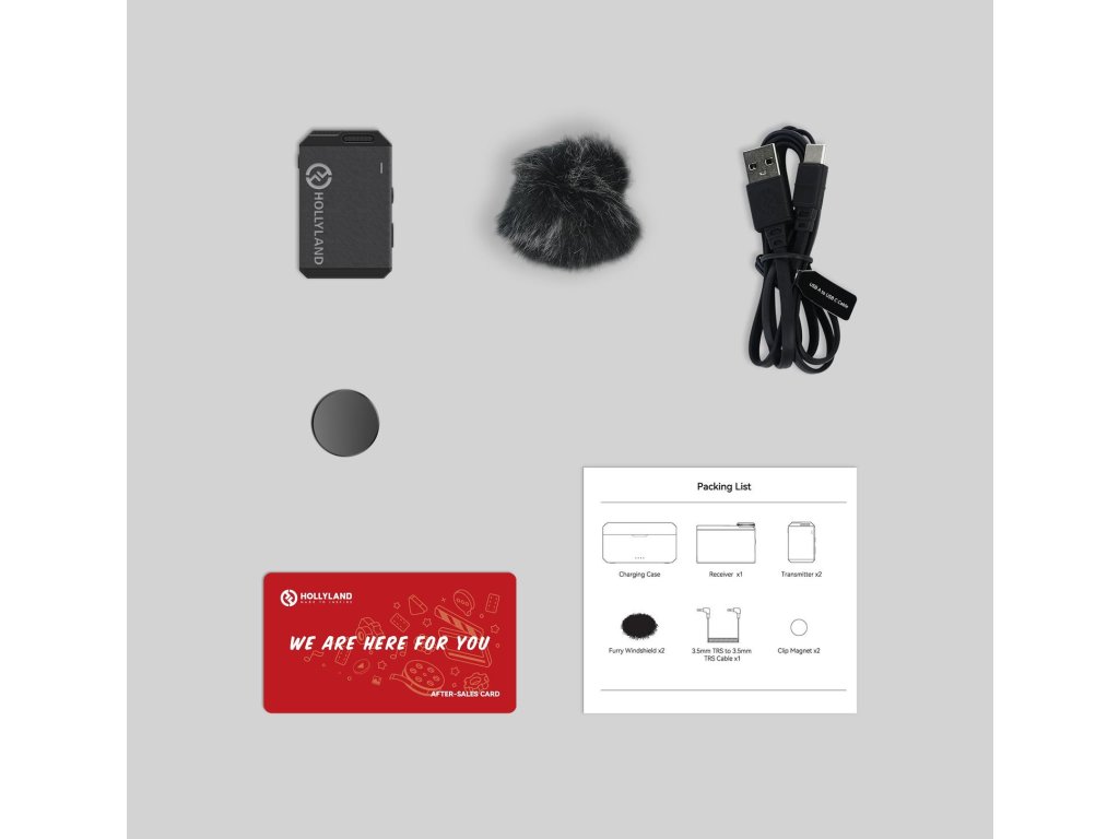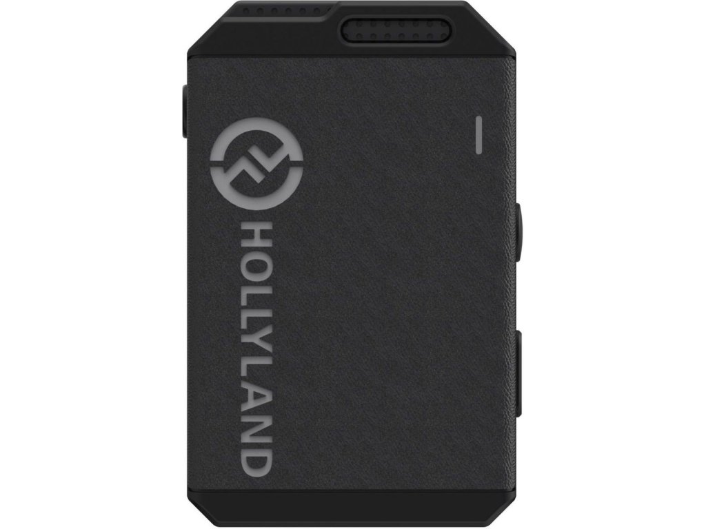 Transmițător Hollyland Lark Max. Include un microfon omnidirectional integrat (cu posibilitatea de conectare a unui microfon extern) cu o sensibilitate de -36 dBFS ± 1dB @1 kHz, 94 dB SPL. Pe lângă TX, pachetul include și o protecție împotriva vântului pentru microfon și un cablu USB-C/USB-A. Varianta neagra.
