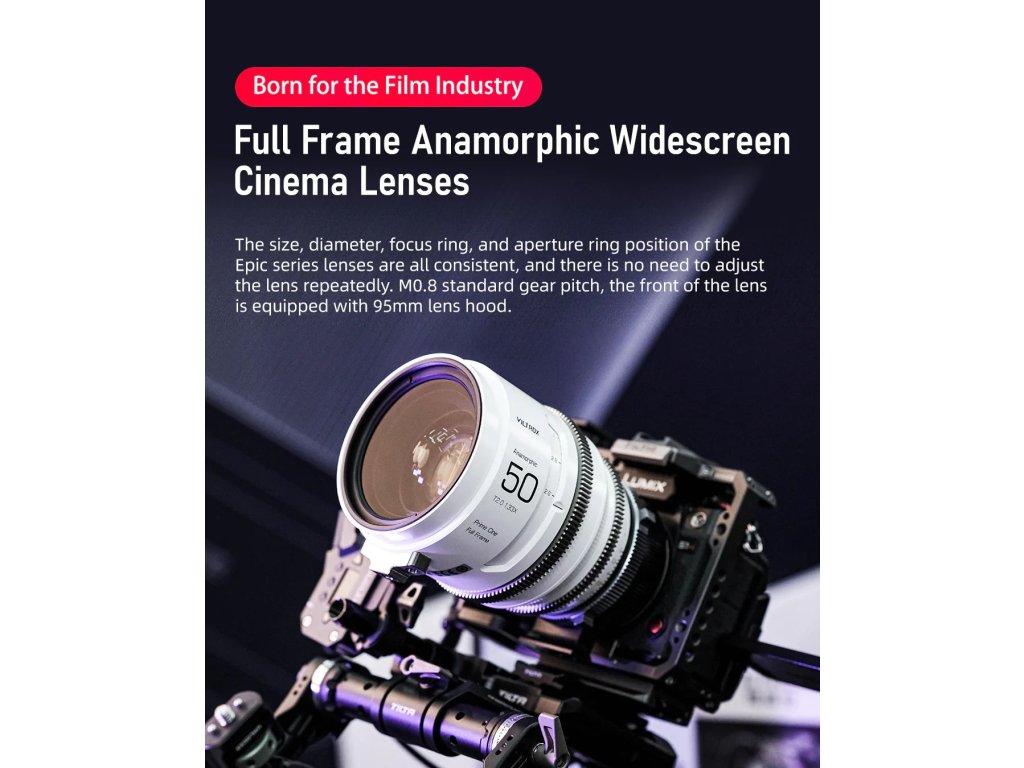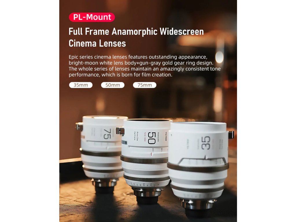 Lentilele anamorfice cu cadru complet Viltrox Epic Series 35/50/75mmT2.0 1.33X sunt proiectate pentru camerele cinematografice cu montură PL, marcând intrarea oficială a Viltrox în industria cinematografică de ultimă generație! Seria Epic oferă un afișaj de imagine impresionant, potrivit pentru lucrul cu unghi larg, cu un raport de aspect de 2,35:1, reproducere retro pură a culorilor, raport de compresie constant de 1,33x, performanță optică consistentă, respirație zero și inele de viteză M0,8.Set de trei lentile, 35mm, 55mm și 75mm T2.0 cu husă de transport.