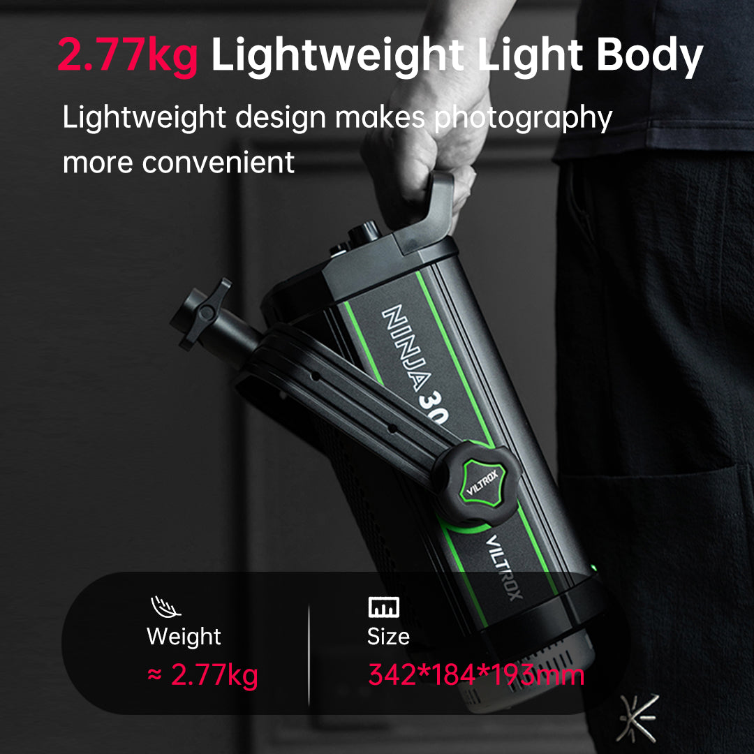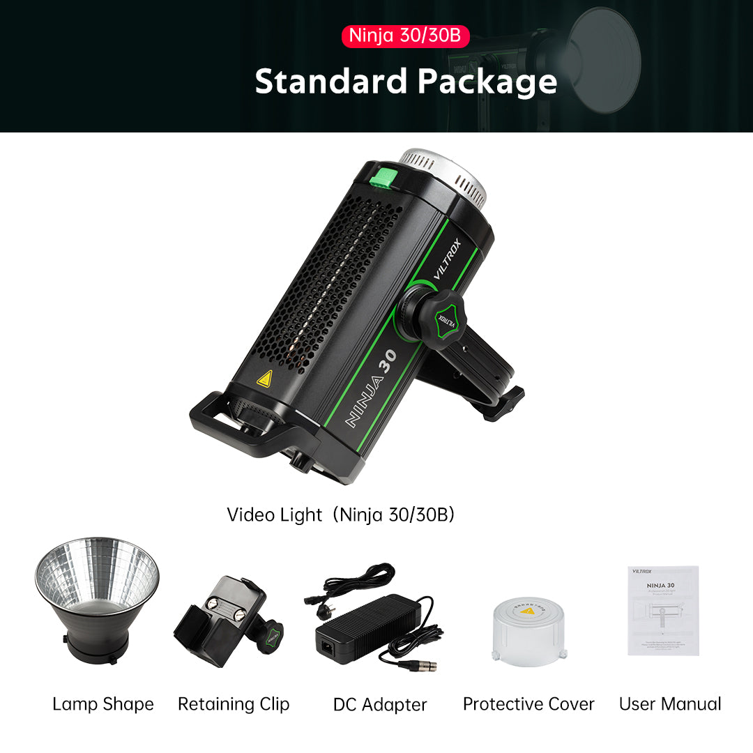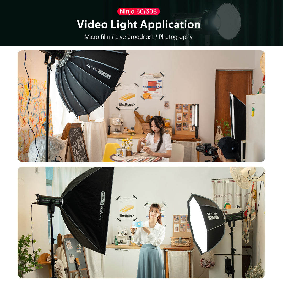 Seria NINJA 30 este echipată cu o montură Bowen la nivel de industrie și este compatibilă cu accesoriile fotografice VILTROX: softbox octogonal, softbox parabolic adânc, difuzor sferic etc. pentru a satisface nevoile de iluminare ale diverselor ocazii.