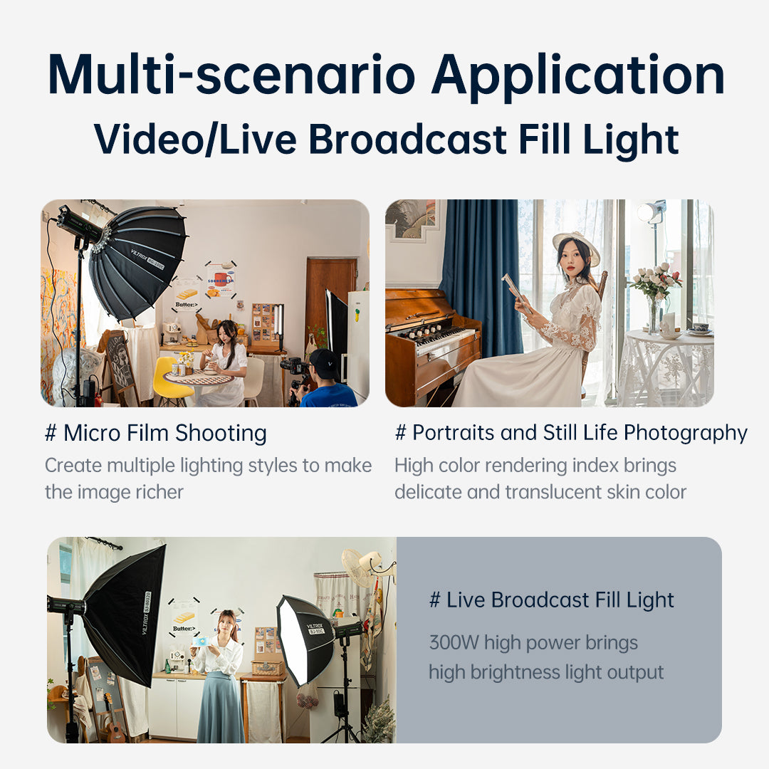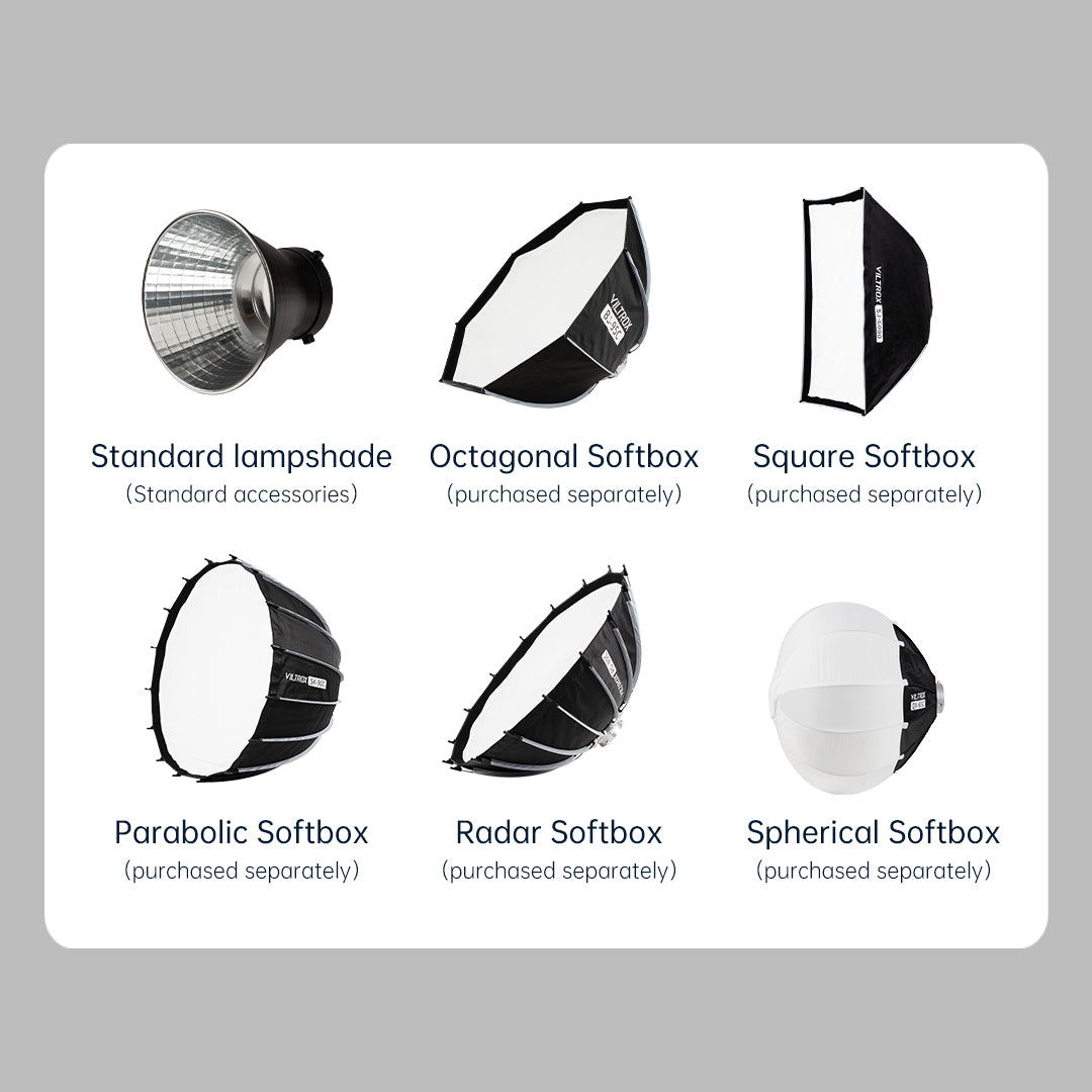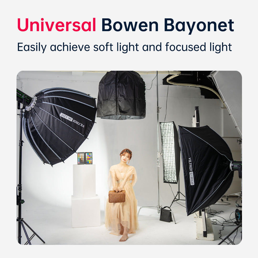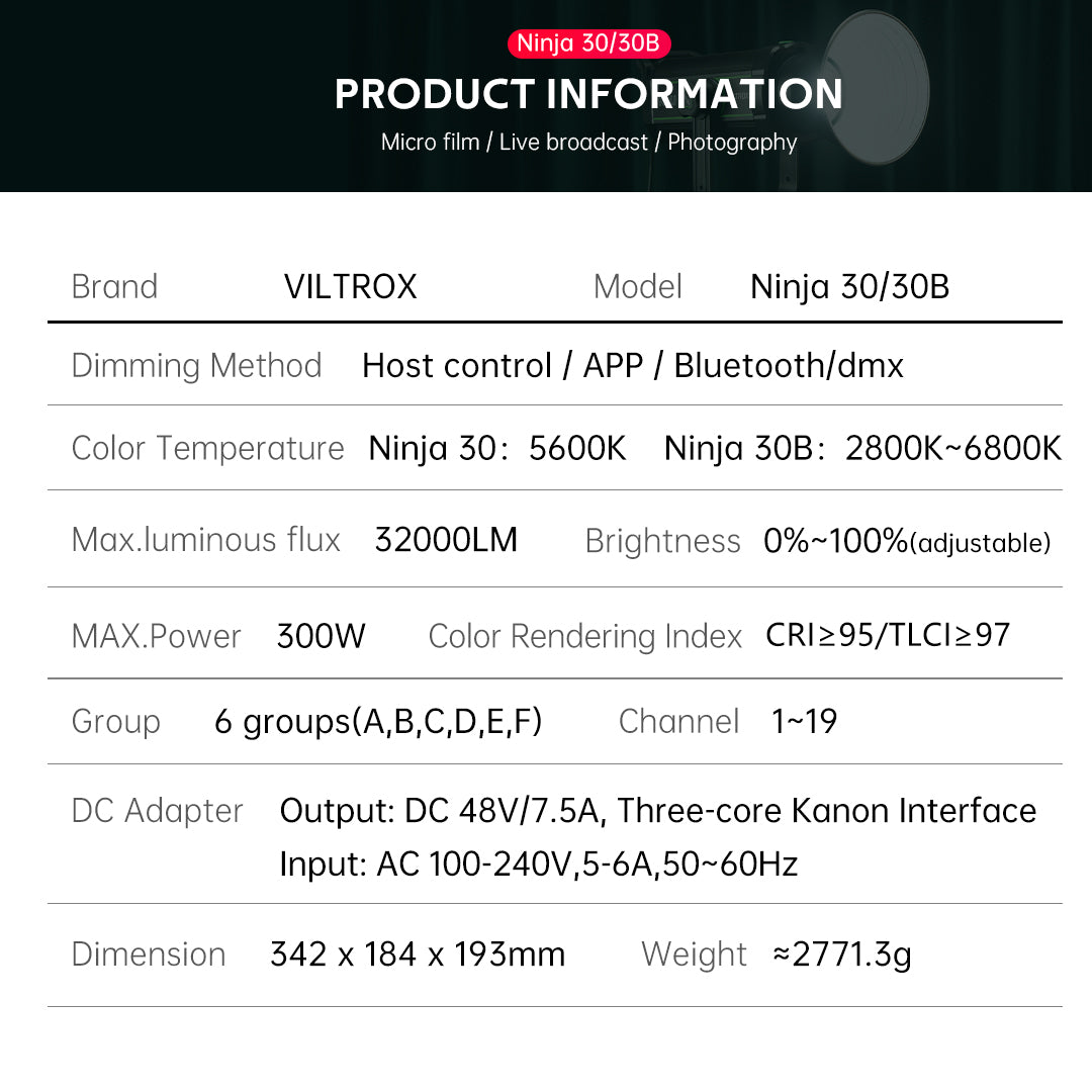 Seria NINJA 30 este echipată cu o montură Bowen la nivel de industrie și este compatibilă cu accesoriile fotografice VILTROX: softbox octogonal, softbox parabolic adânc, difuzor sferic etc. pentru a satisface nevoile de iluminare ale diverselor ocazii.