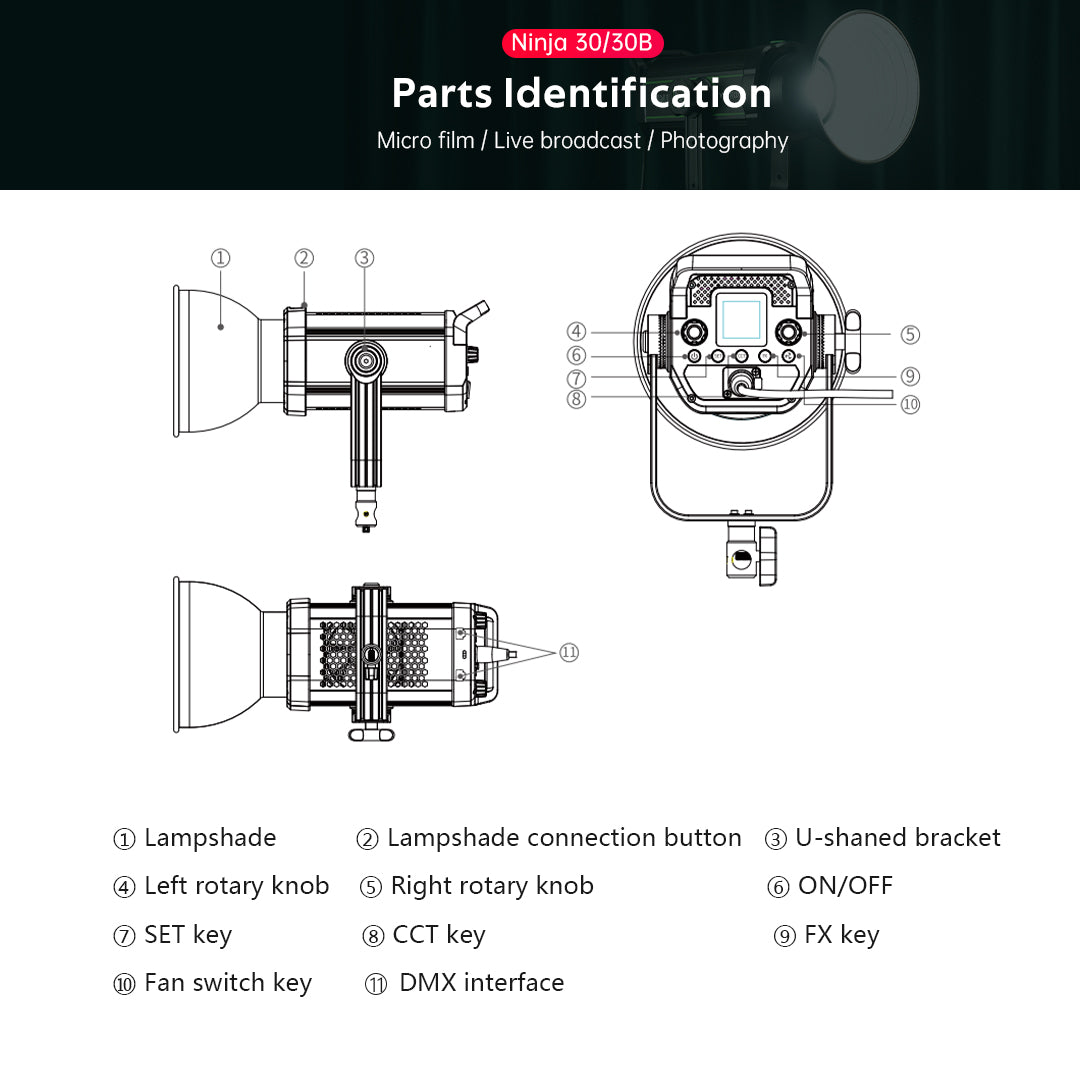 Seria NINJA 30 este o sursă de lumină video LED de 300 W de mare putere, cu putere de iluminare ridicată, acceptă diferite metode profesionale de control, baionetă standard Bowen și diverse accesorii de control al luminii, corp metalic de aluminiu de înaltă calitate. Performanța seriei NINJA 30 a fost îmbunătățită fără precedent din toate punctele de vedere, oferindu-vă o experiență de iluminare a filmului și a televizorului mai profesionistă și mai eficientă!