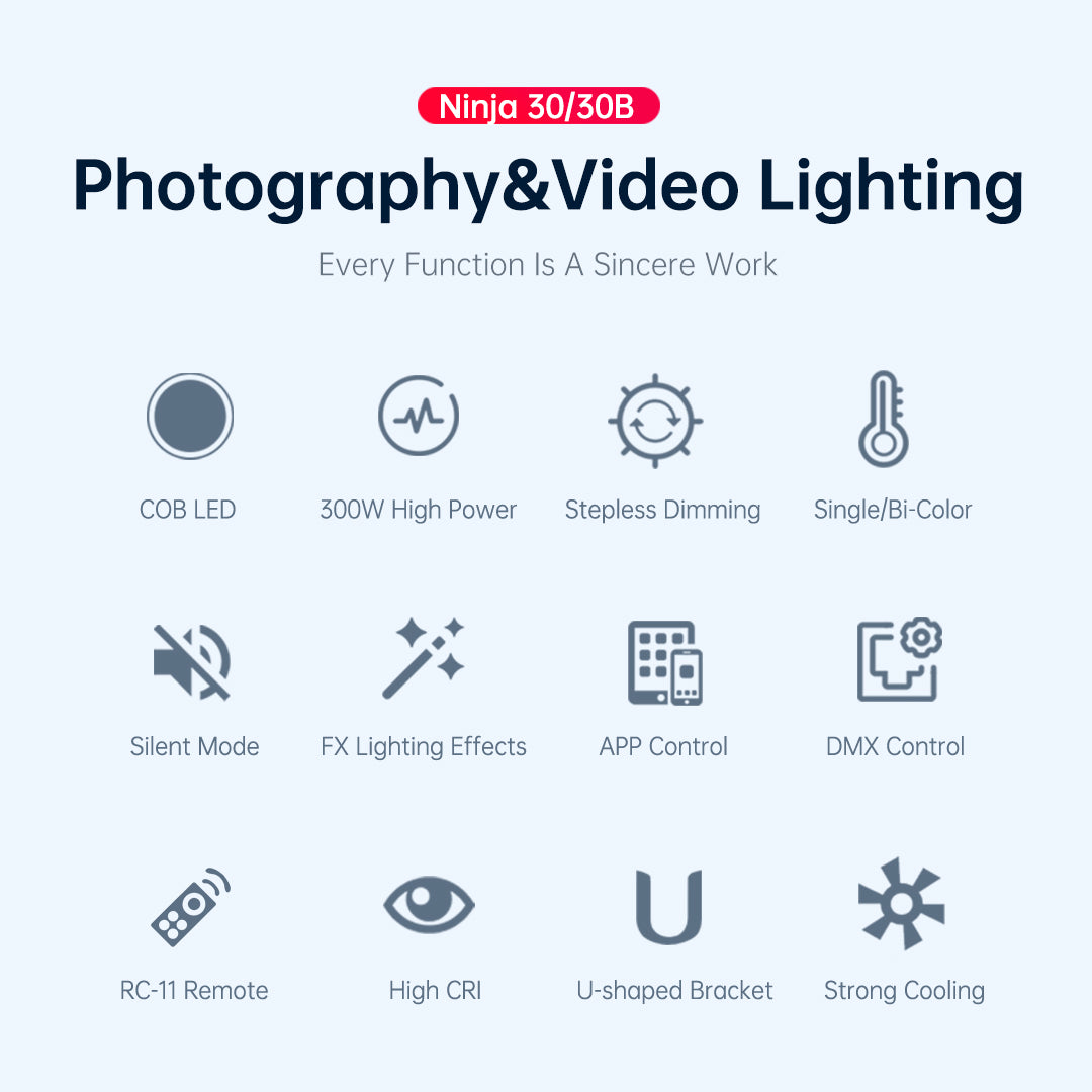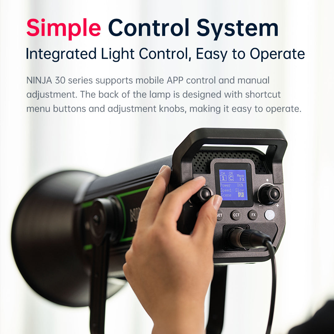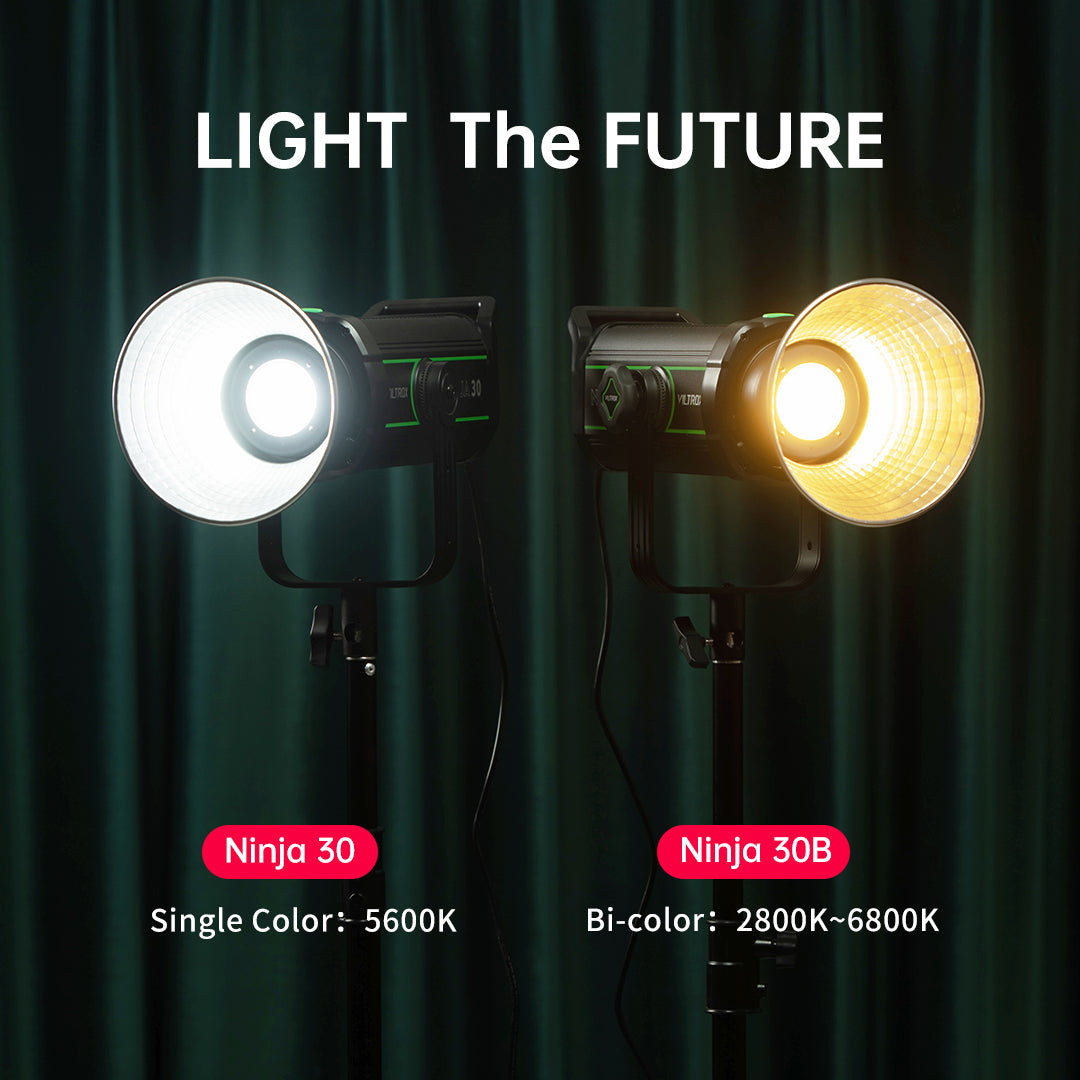 Seria NINJA 30 poate oferi 300 W de luminozitate ridicată. Cu un abajur standard de 55°, iluminarea poate depăși 100.000 LUX la o distanță de 1 metru, ceea ce poate satisface eficient nevoile de filmare a scenelor mari.
