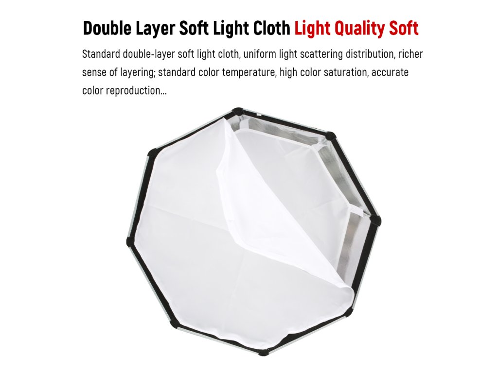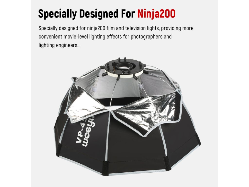Softbox pentruViltrox Weeylite Ninja 200reflector LED. Diametru 60 cm, adancime 30 cm, greutate 0,41 kg. Pachetul include o geanta de transport (dimensiuni pliate 45 x 17 x 17 cm, 0,79 kg).