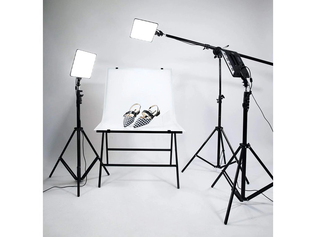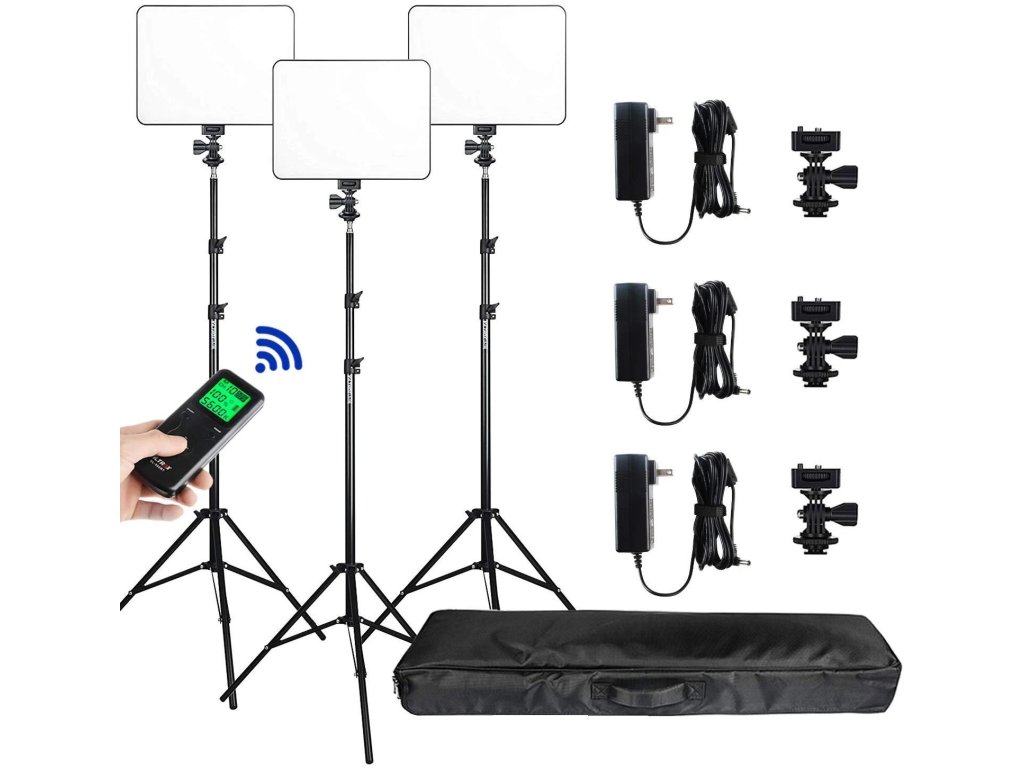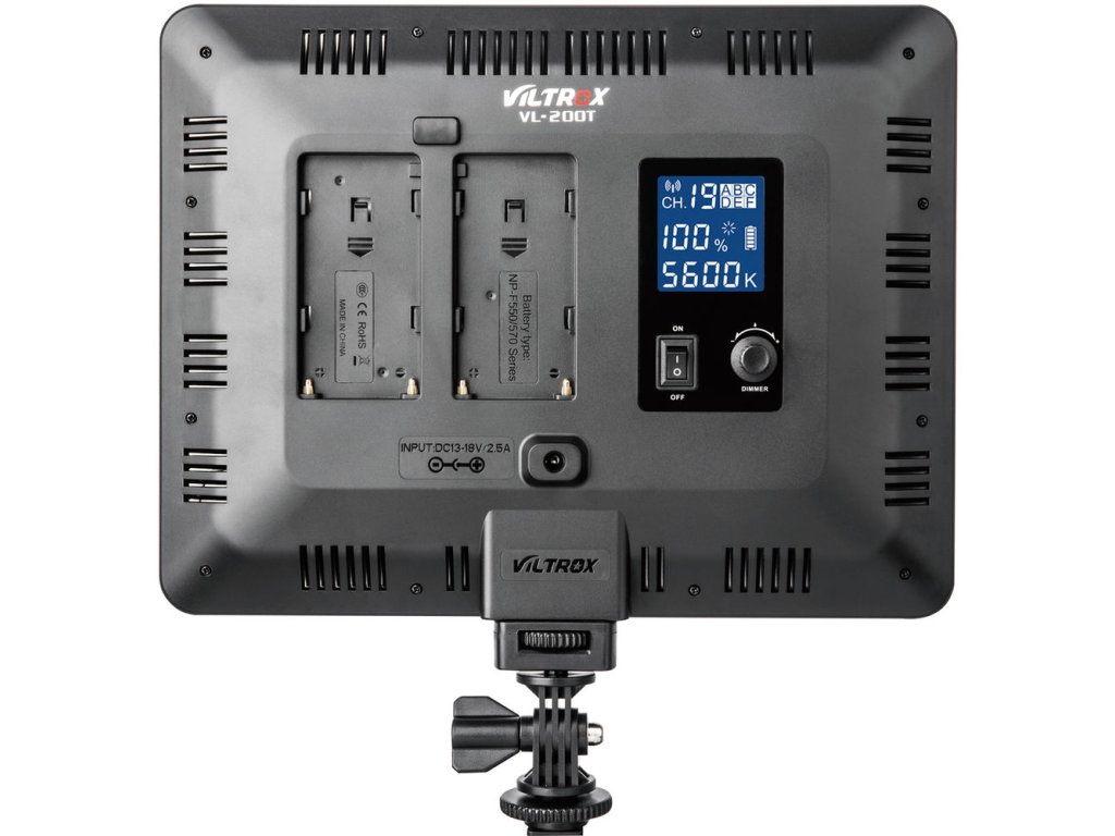 Set de trei lumini Viltrox VL-200T. Lumină LED bicoloră de 30W, ușor de portat, cu temperatură de culoare reglabilă (în intervalul 3300-5600K) și intensitate (20-100%; max. 2500 lm, 2450 lx/0,5 m). Oferă posibilitatea telecomenzii fără fir (2,4 GHz, telecomandă inclusă în pachet) și opțiunea de a fi alimentat cu baterii (NP-F550 / F570 / F960 / F970, baterie neinclusă în pachet) sau alimentare externă ( incluse în pachet). Setările parametrilor sunt facilitate de afișajul LCD ușor de citit. Dimensiuni 260x200x22 mm, greutate 556 g.
