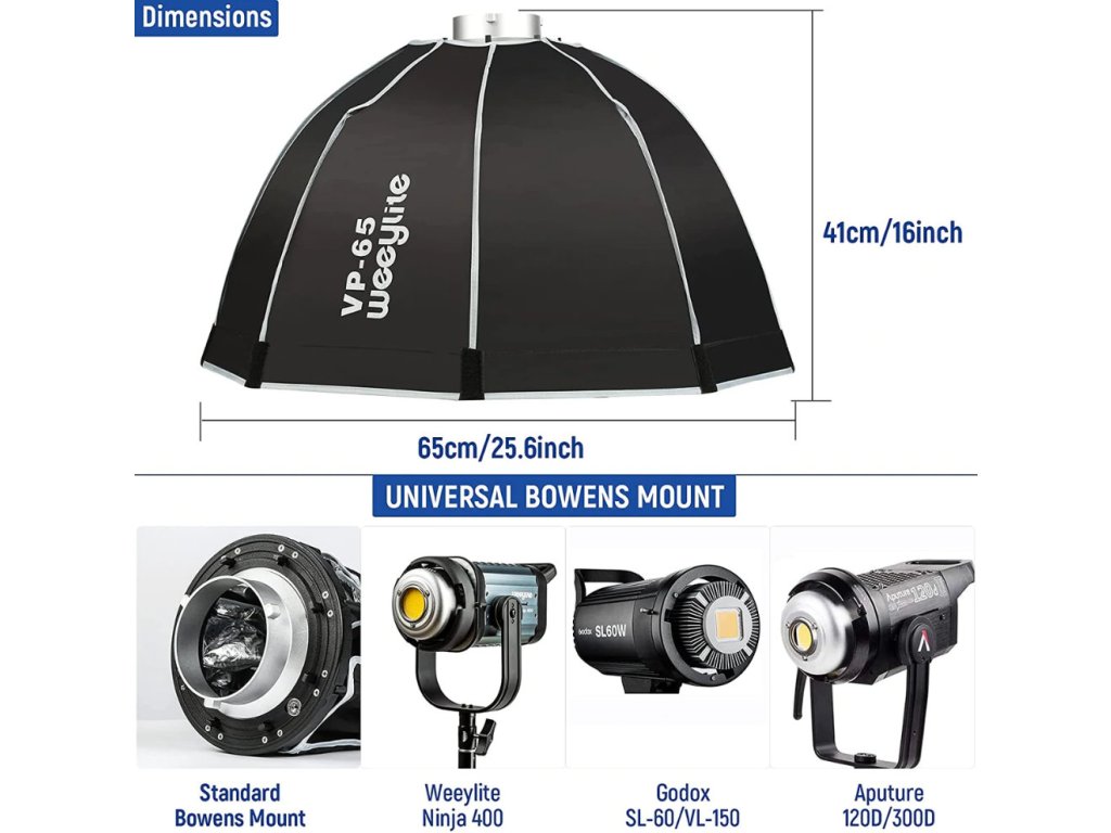 Cu designul universal (montura Bowen), softbox-ul, bila de difuzie și alte accesorii compatibile cu montura Bowen pot fi instalate cu ușurință pentru a satisface nevoile fotografice ale fotografilor și pentru a crea o iluminare mai creativă...