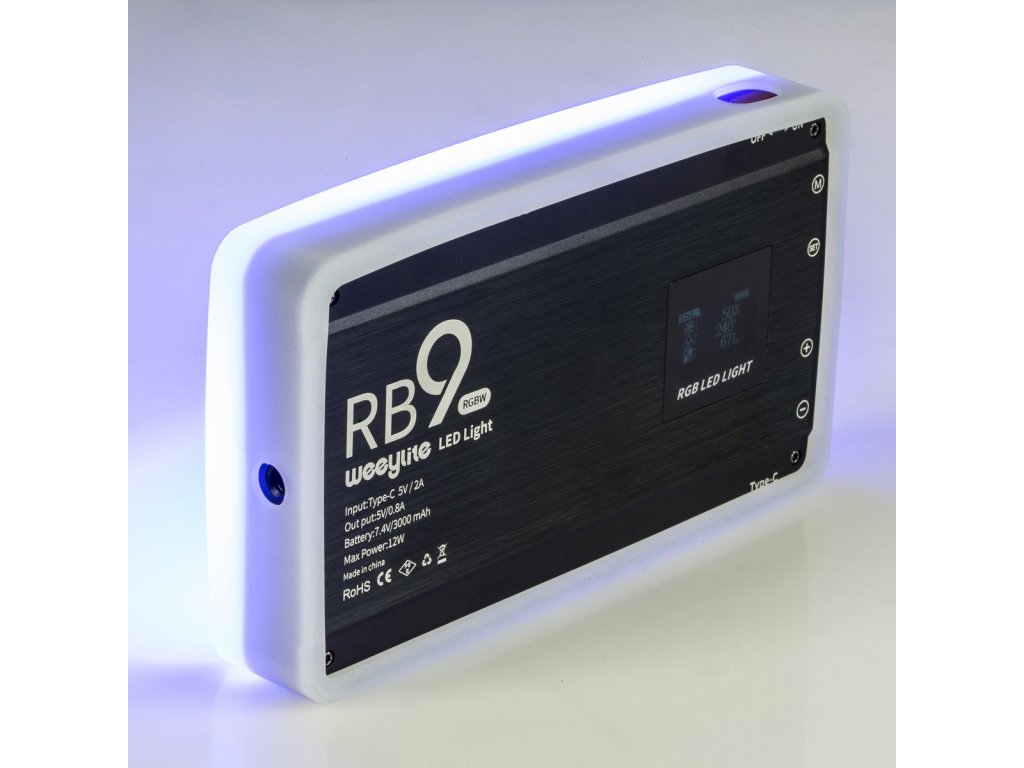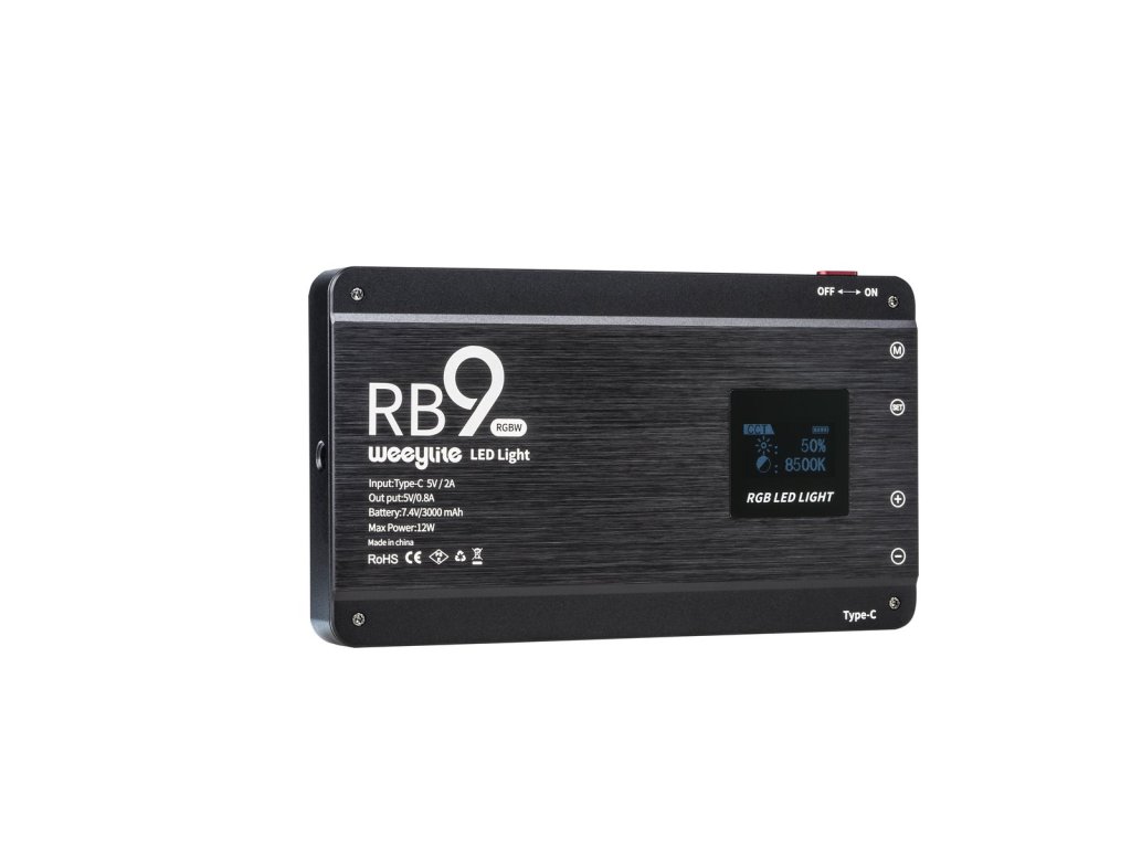 Lampa de umplere fotografică profesională Weeylite RB9 conține 108 LED-uri – 36 RGB, 36 tungsten și 36 de lumină naturală – într-o formă ușoară și compactă. Alegeți dintre 360 de culori în modul RGB sau setați temperatura culorii de la 2.500 la 8.500 K. Lumina este reglabilă de la 100% luminozitate la 0%. Dispozitivul are un șasiu ușor din aluminiu și are un singur buton de pornire/oprire în partea de sus și patru butoane de control în lateral. Ecranul OLED încorporat din spate arată numărul modului și indicatorul bateriei, precum și informații aferente, cum ar fi temperatura culorii, nuanța RGB și saturația sau setările efectelor. Există mai multe culori și efecte de lumină încorporate, cum ar fi lumini puls, cascadă și alarmă.